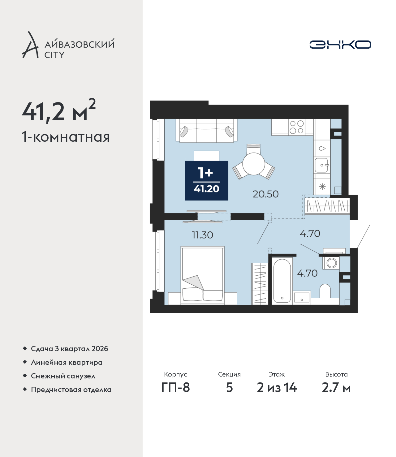 1-комн. квартира с предчистовой отделкой в ЖК "Айвазовский City" на 2 этаже. Общая площадь: 41.2 кв.м., жилая: 11.3 кв.м., площадь просторной кухни-столовой: 20.5 кв.м. Все окна выходят на одну сторону. В квартире один совмещенный санузел. Высота потолков 2.7 м. Дом монолитный, многоподъездный, переменной этажности, от 14 до 24 этажей. Квартира находится в 5-й секции высотой 14 этажей в корпусе ГП-8. На этаже 5 квартир. В подъезде 1 пассажирский и 1 грузовой лифт. Окончание строительства - 3 квартал 2026 года. Оформление сделки по договору долевого участия. Новый жилой район располагается в живописном месте на берегу Туры в центральной части города. Принципиально новое пространство для жизни в центре современного города для тех, чьи мечты сбываются, кто нацелен на постоянный рост, перемены к лучшему для себя и своих близких. Каждая деталь Айвазовский City вдохновляет и заряжает на новые свершения: авторская архитектура, сбалансированная продуманная инфраструктура, дизайнерские дворы со спортивными и детскими площадками, парковые зоны с фонтанами, водный канал, украшающий центральный прогулочный маршрут района и многое другое. В 2019 года проект стал лауреатом престижной премии Urban Awards 2019 в номинации «Лучший строящийся региональный жилой комплекс бизнес-класса». Главная особенность Айвазовский City - соседство разных архитектурных школ в рамках одного дома. Изысканная классика, выразительная эклектика и оригинальный модерн - жить в одном из таких домов настоящий повод для гордости. Айвазовский City это идеальное сочетание комфорта, технологий и развитой инфраструктуры. Вход в подъезд возможен с улицы и со двора. Отправляясь на работу или за покупками, жители могут выйти с внешней стороны дома, а для прогулки с ребенком – со стороны двора. Экологически чистые материалы и энергосберегающие технологии, качественное освещение общественных зон, видеонаблюдение по всей территории жилого района (в том числе в подъездах, лифтах и в подземном паркинге), закрытые дворы с доступом только для жителей Айвазовский City. Часть домов в Айвазовский City будут оснащены подземным паркингом. Востребованный в нашем климатическом поясе формат хранения автомобилей защитит собственность владельца в любое время года. Аккредитация в банках: ПАО «Газпромбанк», ОАО «Альфа-Банк», ПАО Банк «ВТБ», «Сбербанк России», ПАО Банк «ФК Открытие» и других. (AQID02403847)