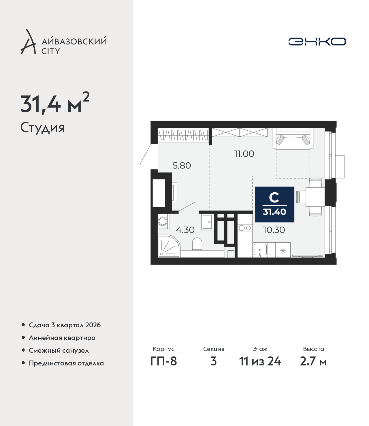 Просторная 1-комн. квартира-студия с предчистовой отделкой в ЖК "Айвазовский City" на 11 этаже. Общая площадь: 31.4 кв.м., площадь гостиной 21.3 кв.м., из которых 10.3 кв.м. выделено под кухонную зону. Все окна выходят на одну сторону. В квартире один совмещенный санузел. Высота потолков 2.7 м. Дом монолитный, многоподъездный, переменной этажности, от 14 до 24 этажей. Квартира находится в 3-й секции высотой 24 этажа в корпусе ГП-8. На этаже 7 квартир. В подъезде 1 пассажирский и 1 грузовой лифт. Окончание строительства - 3 квартал 2026 года. Оформление сделки по договору долевого участия. Новый жилой район располагается в живописном месте на берегу Туры в центральной части города. Принципиально новое пространство для жизни в центре современного города для тех, чьи мечты сбываются, кто нацелен на постоянный рост, перемены к лучшему для себя и своих близких. Каждая деталь Айвазовский City вдохновляет и заряжает на новые свершения: авторская архитектура, сбалансированная продуманная инфраструктура, дизайнерские дворы со спортивными и детскими площадками, парковые зоны с фонтанами, водный канал, украшающий центральный прогулочный маршрут района и многое другое. В 2019 года проект стал лауреатом престижной премии Urban Awards 2019 в номинации «Лучший строящийся региональный жилой комплекс бизнес-класса». Главная особенность Айвазовский City - соседство разных архитектурных школ в рамках одного дома. Изысканная классика, выразительная эклектика и оригинальный модерн - жить в одном из таких домов настоящий повод для гордости. Айвазовский City это идеальное сочетание комфорта, технологий и развитой инфраструктуры. Вход в подъезд возможен с улицы и со двора. Отправляясь на работу или за покупками, жители могут выйти с внешней стороны дома, а для прогулки с ребенком – со стороны двора. Экологически чистые материалы и энергосберегающие технологии, качественное освещение общественных зон, видеонаблюдение по всей территории жилого района (в том числе в подъездах, лифтах и в подземном паркинге), закрытые дворы с доступом только для жителей Айвазовский City. Часть домов в Айвазовский City будут оснащены подземным паркингом. Востребованный в нашем климатическом поясе формат хранения автомобилей защитит собственность владельца в любое время года. Аккредитация в банках: ПАО «Газпромбанк», «Сбербанк России», ПАО Банк «ВТБ», ОАО «Альфа-Банк», ПАО Банк «ФК Открытие» и других. (AQID02453728)