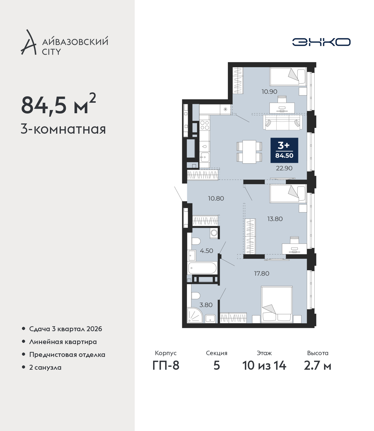 Просторная 3-комн. квартира с предчистовой отделкой в ЖК "Айвазовский City" на 10 этаже. Общая площадь: 84.5 кв.м., жилая: 42.5 кв.м., площадь просторной кухни-столовой: 22.9 кв.м. Комнаты изолированные, все окна выходят на одну сторону. В квартире два совмещенных санузла. Высота потолков 2.7 м. Дом монолитный, многоподъездный, переменной этажности, от 14 до 24 этажей. Квартира находится в 5-й секции высотой 14 этажей в корпусе ГП-8. На этаже 5 квартир. В подъезде 1 пассажирский и 1 грузовой лифт. Окончание строительства - 3 квартал 2026 года. Оформление сделки по договору долевого участия. Новый жилой район располагается в живописном месте на берегу Туры в центральной части города. Принципиально новое пространство для жизни в центре современного города для тех, чьи мечты сбываются, кто нацелен на постоянный рост, перемены к лучшему для себя и своих близких. Каждая деталь Айвазовский City вдохновляет и заряжает на новые свершения: авторская архитектура, сбалансированная продуманная инфраструктура, дизайнерские дворы со спортивными и детскими площадками, парковые зоны с фонтанами, водный канал, украшающий центральный прогулочный маршрут района и многое другое. В 2019 года проект стал лауреатом престижной премии Urban Awards 2019 в номинации «Лучший строящийся региональный жилой комплекс бизнес-класса». Главная особенность Айвазовский City - соседство разных архитектурных школ в рамках одного дома. Изысканная классика, выразительная эклектика и оригинальный модерн - жить в одном из таких домов настоящий повод для гордости. Айвазовский City это идеальное сочетание комфорта, технологий и развитой инфраструктуры. Вход в подъезд возможен с улицы и со двора. Отправляясь на работу или за покупками, жители могут выйти с внешней стороны дома, а для прогулки с ребенком – со стороны двора. Экологически чистые материалы и энергосберегающие технологии, качественное освещение общественных зон, видеонаблюдение по всей территории жилого района (в том числе в подъездах, лифтах и в подземном паркинге), закрытые дворы с доступом только для жителей Айвазовский City. Часть домов в Айвазовский City будут оснащены подземным паркингом. Востребованный в нашем климатическом поясе формат хранения автомобилей защитит собственность владельца в любое время года. Аккредитация в банках: ОАО «Альфа-Банк», ПАО «Газпромбанк», «Сбербанк России», ПАО Банк «ВТБ», ПАО «Промсвязьбанк» и других. (AQID02453778)
