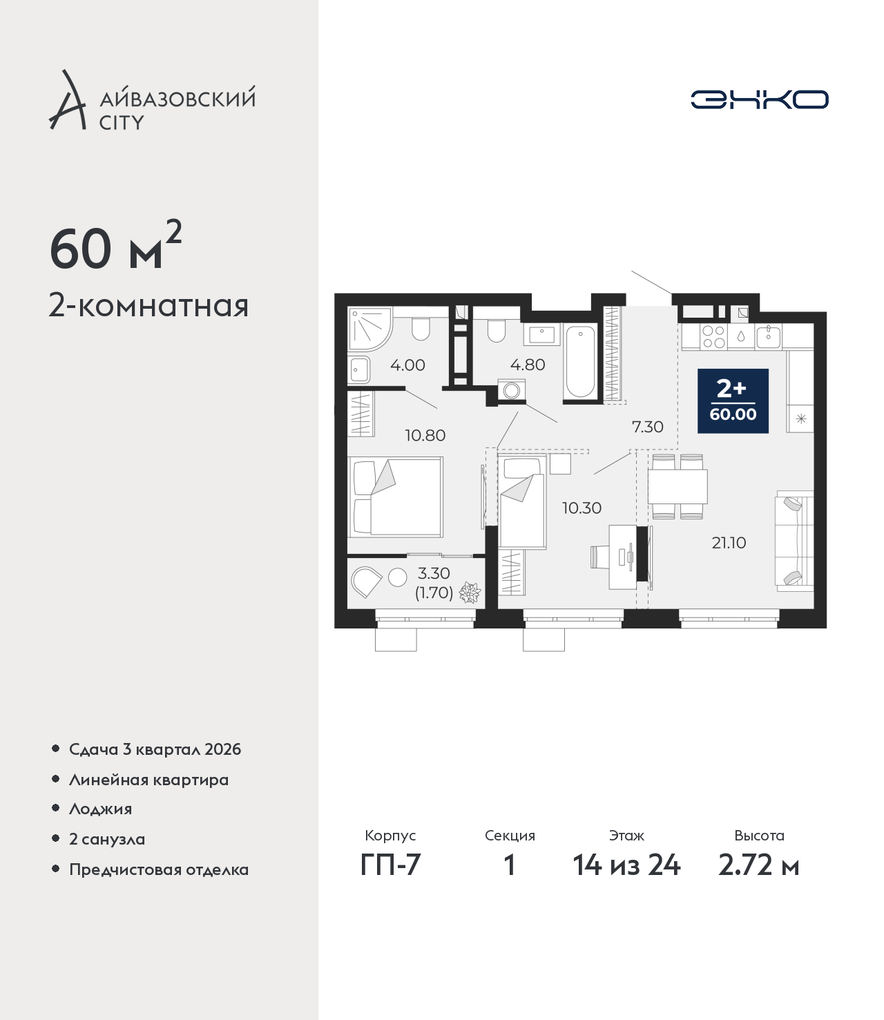 Продается двухкомнатная квартира с предчистовой отделкой в ЖК "Айвазовский City" на 14 этаже. Общая площадь: 60 кв.м., жилая: 21.1 кв.м., площадь просторной кухни-столовой: 21.1 кв.м. Комнаты изолированные, все окна выходят на одну сторону. В квартире одна лоджия, два совмещенных санузла. Высота потолков 2.72 м. Дом монолитный, многоподъездный, переменной этажности, от 9 до 24 этажей. Квартира находится в 1-й секции высотой 24 этажа в корпусе ГП-7. На этаже 6 квартир. В подъезде 1 пассажирский и 2 грузовых лифта. Окончание строительства - 3 квартал 2026 года. Оформление сделки по договору долевого участия. Новый жилой район располагается в живописном месте на берегу Туры в центральной части города. Принципиально новое пространство для жизни в центре современного города для тех, чьи мечты сбываются, кто нацелен на постоянный рост, перемены к лучшему для себя и своих близких. Каждая деталь Айвазовский City вдохновляет и заряжает на новые свершения: авторская архитектура, сбалансированная продуманная инфраструктура, дизайнерские дворы со спортивными и детскими площадками, парковые зоны с фонтанами, водный канал, украшающий центральный прогулочный маршрут района и многое другое. В 2019 года проект стал лауреатом престижной премии Urban Awards 2019 в номинации «Лучший строящийся региональный жилой комплекс бизнес-класса». Главная особенность Айвазовский City - соседство разных архитектурных школ в рамках одного дома. Изысканная классика, выразительная эклектика и оригинальный модерн - жить в одном из таких домов настоящий повод для гордости. Айвазовский City это идеальное сочетание комфорта, технологий и развитой инфраструктуры. Вход в подъезд возможен с улицы и со двора. Отправляясь на работу или за покупками, жители могут выйти с внешней стороны дома, а для прогулки с ребенком – со стороны двора. Экологически чистые материалы и энергосберегающие технологии, качественное освещение общественных зон, видеонаблюдение по всей территории жилого района (в том числе в подъездах, лифтах и в подземном паркинге), закрытые дворы с доступом только для жителей Айвазовский City. Часть домов в Айвазовский City будут оснащены подземным паркингом. Востребованный в нашем климатическом поясе формат хранения автомобилей защитит собственность владельца в любое время года. Аккредитация в банках: «Сбербанк России», ПАО «Газпромбанк», ОАО «Альфа-Банк», ПАО Банк «ВТБ», ПАО «Совкомбанк» и других. (AQID02487905)