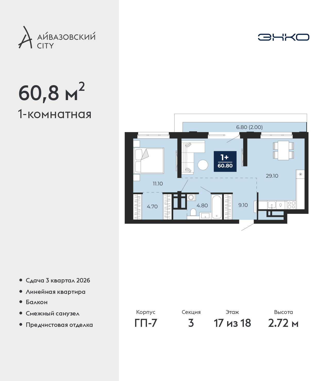 Просторная однокомнатная квартира с предчистовой отделкой в ЖК "Айвазовский City" на 17 этаже. Общая площадь: 60.8 кв.м., жилая: 11.1 кв.м., площадь просторной кухни-столовой: 29.1 кв.м. Все окна выходят на одну сторону. В квартире один балкон, один совмещенный санузел. Высота потолков 2.72 м. Дом монолитный, многоподъездный, переменной этажности, от 9 до 24 этажей. Квартира находится в 3-й секции высотой 18 этажей в корпусе ГП-7. На этаже 5 квартир. В подъезде 1 пассажирский и 2 грузовых лифта. Окончание строительства - 3 квартал 2026 года. Оформление сделки по договору долевого участия. Новый жилой район располагается в живописном месте на берегу Туры в центральной части города. Принципиально новое пространство для жизни в центре современного города для тех, чьи мечты сбываются, кто нацелен на постоянный рост, перемены к лучшему для себя и своих близких. Каждая деталь Айвазовский City вдохновляет и заряжает на новые свершения: авторская архитектура, сбалансированная продуманная инфраструктура, дизайнерские дворы со спортивными и детскими площадками, парковые зоны с фонтанами, водный канал, украшающий центральный прогулочный маршрут района и многое другое. В 2019 года проект стал лауреатом престижной премии Urban Awards 2019 в номинации «Лучший строящийся региональный жилой комплекс бизнес-класса». Главная особенность Айвазовский City - соседство разных архитектурных школ в рамках одного дома. Изысканная классика, выразительная эклектика и оригинальный модерн - жить в одном из таких домов настоящий повод для гордости. Айвазовский City это идеальное сочетание комфорта, технологий и развитой инфраструктуры. Вход в подъезд возможен с улицы и со двора. Отправляясь на работу или за покупками, жители могут выйти с внешней стороны дома, а для прогулки с ребенком – со стороны двора. Экологически чистые материалы и энергосберегающие технологии, качественное освещение общественных зон, видеонаблюдение по всей территории жилого района (в том числе в подъездах, лифтах и в подземном паркинге), закрытые дворы с доступом только для жителей Айвазовский City. Часть домов в Айвазовский City будут оснащены подземным паркингом. Востребованный в нашем климатическом поясе формат хранения автомобилей защитит собственность владельца в любое время года. Аккредитация в банках: «Сбербанк России», ПАО Банк «ВТБ», ПАО «Газпромбанк», ОАО «Альфа-Банк», ПАО Банк «ФК Открытие» и других. (AQID02487967)