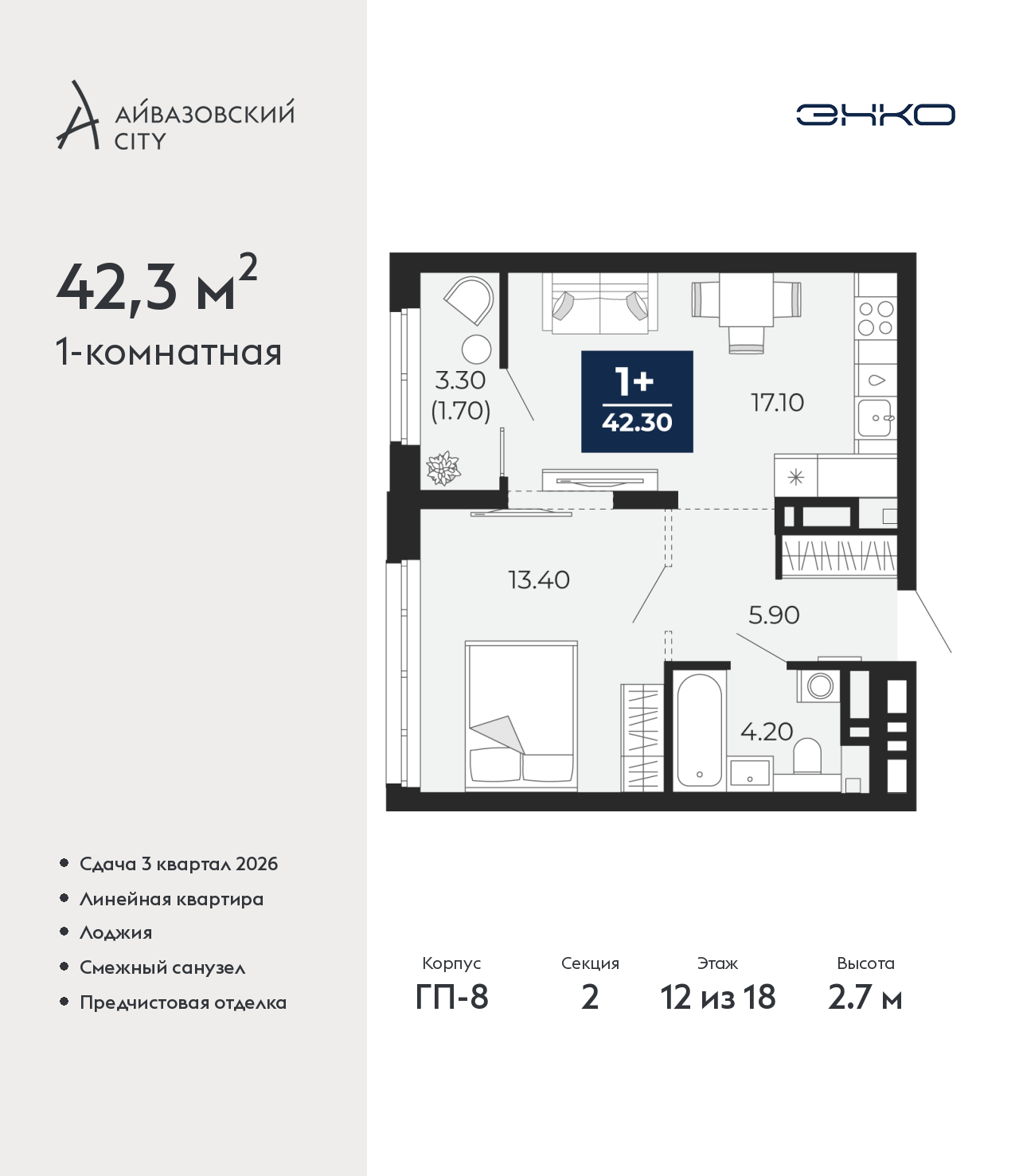 Однокомнатная квартира с предчистовой отделкой в ЖК "Айвазовский City" на 12 этаже. Общая площадь: 42.3 кв.м., жилая: 13.4 кв.м., площадь просторной кухни-столовой: 17.1 кв.м. Все окна выходят на одну сторону. В квартире одна лоджия, один совмещенный санузел. Высота потолков 2.7 м. Дом монолитный, многоподъездный, переменной этажности, от 14 до 24 этажей. Квартира находится во 2-й секции высотой 18 этажей в корпусе ГП-8. На этаже 5 квартир. В подъезде 1 пассажирский и 1 грузовой лифт. Окончание строительства - 3 квартал 2026 года. Оформление сделки по договору долевого участия. Новый жилой район располагается в живописном месте на берегу Туры в центральной части города. Принципиально новое пространство для жизни в центре современного города для тех, чьи мечты сбываются, кто нацелен на постоянный рост, перемены к лучшему для себя и своих близких. Каждая деталь Айвазовский City вдохновляет и заряжает на новые свершения: авторская архитектура, сбалансированная продуманная инфраструктура, дизайнерские дворы со спортивными и детскими площадками, парковые зоны с фонтанами, водный канал, украшающий центральный прогулочный маршрут района и многое другое. В 2019 года проект стал лауреатом престижной премии Urban Awards 2019 в номинации «Лучший строящийся региональный жилой комплекс бизнес-класса». Главная особенность Айвазовский City - соседство разных архитектурных школ в рамках одного дома. Изысканная классика, выразительная эклектика и оригинальный модерн - жить в одном из таких домов настоящий повод для гордости. Айвазовский City это идеальное сочетание комфорта, технологий и развитой инфраструктуры. Вход в подъезд возможен с улицы и со двора. Отправляясь на работу или за покупками, жители могут выйти с внешней стороны дома, а для прогулки с ребенком – со стороны двора. Экологически чистые материалы и энергосберегающие технологии, качественное освещение общественных зон, видеонаблюдение по всей территории жилого района (в том числе в подъездах, лифтах и в подземном паркинге), закрытые дворы с доступом только для жителей Айвазовский City. Часть домов в Айвазовский City будут оснащены подземным паркингом. Востребованный в нашем климатическом поясе формат хранения автомобилей защитит собственность владельца в любое время года. Аккредитация в банках: ОАО «Альфа-Банк», «Сбербанк России», ПАО «Газпромбанк», ПАО Банк «ВТБ», ПАО АКБ «Абсолют Банк» и других. (AQID02487990)