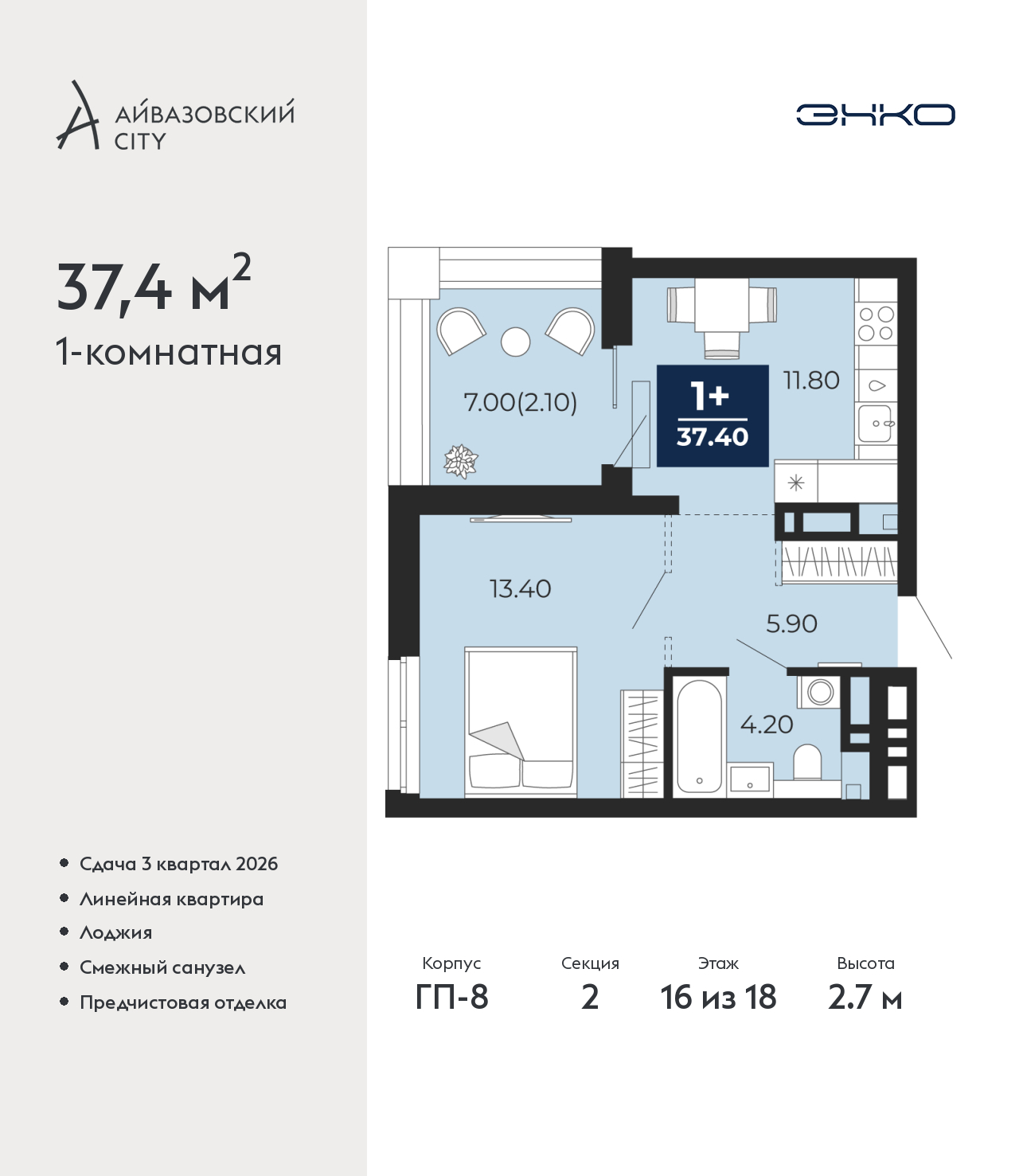 Однокомнатная квартира от застройщика с предчистовой отделкой в ЖК "Айвазовский City" на 16 этаже. Общая площадь: 37.4 кв.м., жилая: 13.4 кв.м., площадь просторной кухни-столовой: 11.8 кв.м. Все окна выходят на одну сторону. В квартире одна лоджия, один совмещенный санузел. Наличие террасы в квартире открывает возможность для обустройства дополнительной площади. Высота потолков 2.7 м. Дом монолитный, многоподъездный, переменной этажности, от 14 до 24 этажей. Квартира находится во 2-й секции высотой 18 этажей в корпусе ГП-8. На этаже 5 квартир. В подъезде 1 пассажирский и 1 грузовой лифт. Окончание строительства - 3 квартал 2026 года. Оформление сделки по договору долевого участия. Новый жилой район располагается в живописном месте на берегу Туры в центральной части города. Принципиально новое пространство для жизни в центре современного города для тех, чьи мечты сбываются, кто нацелен на постоянный рост, перемены к лучшему для себя и своих близких. Каждая деталь Айвазовский City вдохновляет и заряжает на новые свершения: авторская архитектура, сбалансированная продуманная инфраструктура, дизайнерские дворы со спортивными и детскими площадками, парковые зоны с фонтанами, водный канал, украшающий центральный прогулочный маршрут района и многое другое. В 2019 года проект стал лауреатом престижной премии Urban Awards 2019 в номинации «Лучший строящийся региональный жилой комплекс бизнес-класса». Главная особенность Айвазовский City - соседство разных архитектурных школ в рамках одного дома. Изысканная классика, выразительная эклектика и оригинальный модерн - жить в одном из таких домов настоящий повод для гордости. Айвазовский City это идеальное сочетание комфорта, технологий и развитой инфраструктуры. Вход в подъезд возможен с улицы и со двора. Отправляясь на работу или за покупками, жители могут выйти с внешней стороны дома, а для прогулки с ребенком – со стороны двора. Экологически чистые материалы и энергосберегающие технологии, качественное освещение общественных зон, видеонаблюдение по всей территории жилого района (в том числе в подъездах, лифтах и в подземном паркинге), закрытые дворы с доступом только для жителей Айвазовский City. Часть домов в Айвазовский City будут оснащены подземным паркингом. Востребованный в нашем климатическом поясе формат хранения автомобилей защитит собственность владельца в любое время года. Аккредитация в банках: ПАО Банк «ВТБ», «Сбербанк России», ОАО «Альфа-Банк», ПАО «Газпромбанк», АО "ДОМ.РФ" и других. (AQID02487996)