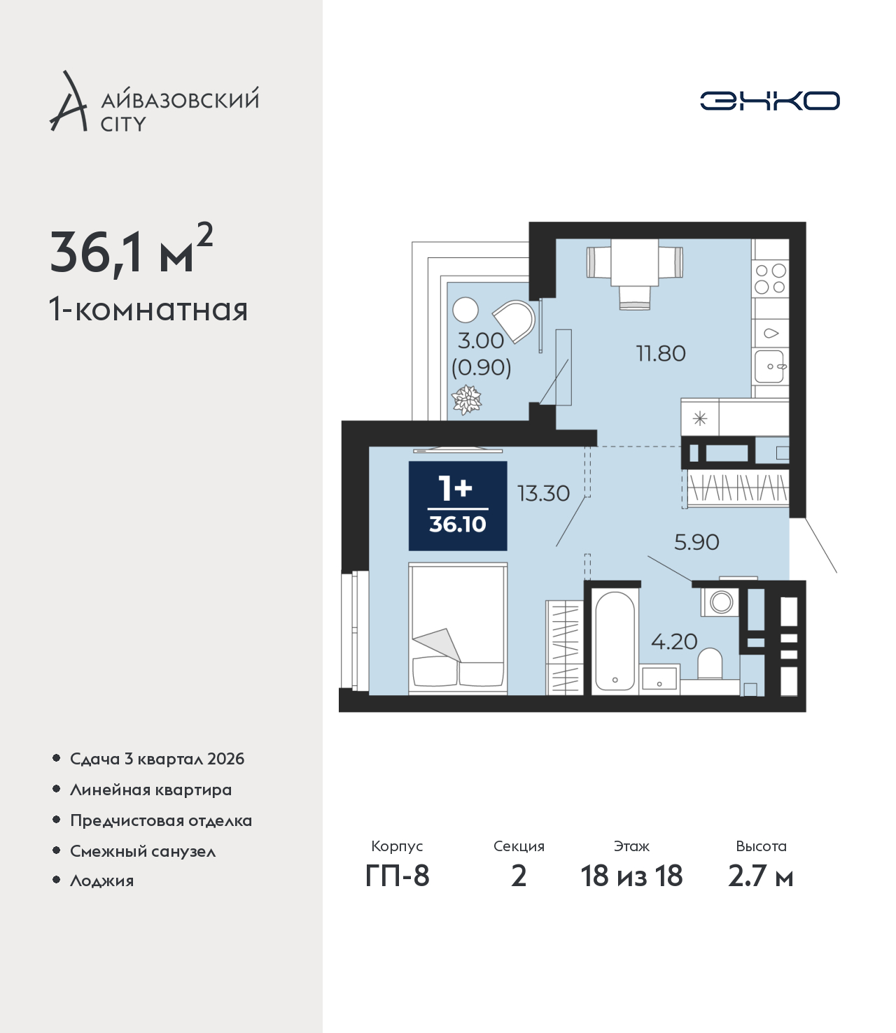 Просторная 1-комн. квартира с предчистовой отделкой в ЖК "Айвазовский City" на 18 этаже. Общая площадь: 36.1 кв.м., жилая: 13.3 кв.м., площадь просторной кухни-столовой: 11.8 кв.м. Все окна выходят на одну сторону. В квартире одна лоджия, один совмещенный санузел. Высота потолков 2.7 м. Дом монолитный, многоподъездный, переменной этажности, от 14 до 24 этажей. Квартира находится во 2-й секции высотой 18 этажей в корпусе ГП-8. На этаже 5 квартир. В подъезде 1 пассажирский и 1 грузовой лифт. Окончание строительства - 3 квартал 2026 года. Оформление сделки по договору долевого участия. Новый жилой район располагается в живописном месте на берегу Туры в центральной части города. Принципиально новое пространство для жизни в центре современного города для тех, чьи мечты сбываются, кто нацелен на постоянный рост, перемены к лучшему для себя и своих близких. Каждая деталь Айвазовский City вдохновляет и заряжает на новые свершения: авторская архитектура, сбалансированная продуманная инфраструктура, дизайнерские дворы со спортивными и детскими площадками, парковые зоны с фонтанами, водный канал, украшающий центральный прогулочный маршрут района и многое другое. В 2019 года проект стал лауреатом престижной премии Urban Awards 2019 в номинации «Лучший строящийся региональный жилой комплекс бизнес-класса». Главная особенность Айвазовский City - соседство разных архитектурных школ в рамках одного дома. Изысканная классика, выразительная эклектика и оригинальный модерн - жить в одном из таких домов настоящий повод для гордости. Айвазовский City это идеальное сочетание комфорта, технологий и развитой инфраструктуры. Вход в подъезд возможен с улицы и со двора. Отправляясь на работу или за покупками, жители могут выйти с внешней стороны дома, а для прогулки с ребенком – со стороны двора. Экологически чистые материалы и энергосберегающие технологии, качественное освещение общественных зон, видеонаблюдение по всей территории жилого района (в том числе в подъездах, лифтах и в подземном паркинге), закрытые дворы с доступом только для жителей Айвазовский City. Часть домов в Айвазовский City будут оснащены подземным паркингом. Востребованный в нашем климатическом поясе формат хранения автомобилей защитит собственность владельца в любое время года. Аккредитация в банках: ПАО «Газпромбанк», ОАО «Альфа-Банк», ПАО Банк «ВТБ», «Сбербанк России», ПАО «Совкомбанк» и других. (AQID02488002)