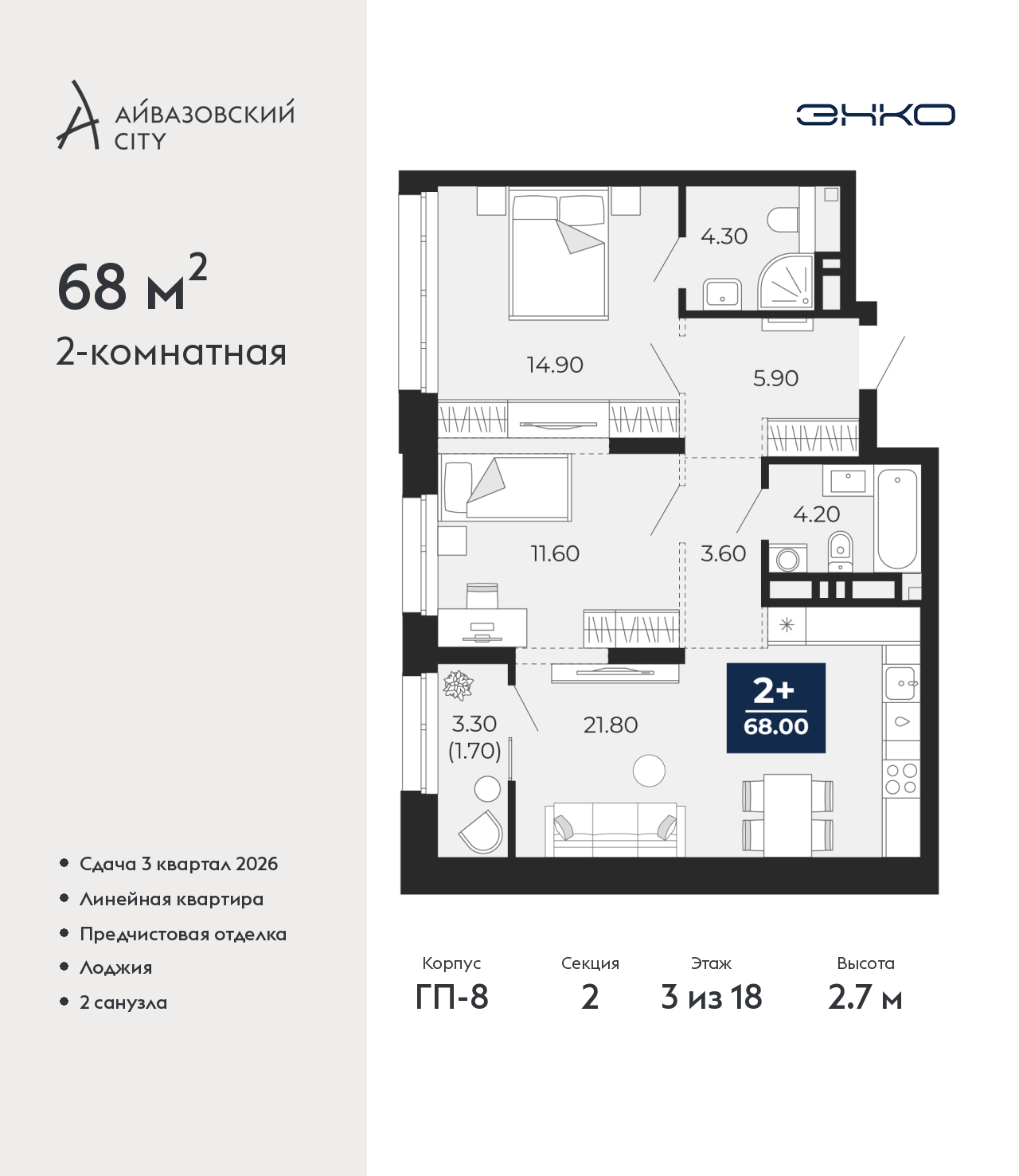 Двухкомнатная квартира от застройщика с предчистовой отделкой в ЖК "Айвазовский City" на 3 этаже. Общая площадь: 68 кв.м., жилая: 26.5 кв.м., площадь просторной кухни-столовой: 21.8 кв.м. Комнаты изолированные, все окна выходят на одну сторону. В квартире одна лоджия, два совмещенных санузла. Высота потолков 2.7 м. Дом монолитный, многоподъездный, переменной этажности, от 14 до 24 этажей. Квартира находится во 2-й секции высотой 18 этажей в корпусе ГП-8. На этаже 5 квартир. В подъезде 1 пассажирский и 1 грузовой лифт. Окончание строительства - 3 квартал 2026 года. Оформление сделки по договору долевого участия. Новый жилой район располагается в живописном месте на берегу Туры в центральной части города. Принципиально новое пространство для жизни в центре современного города для тех, чьи мечты сбываются, кто нацелен на постоянный рост, перемены к лучшему для себя и своих близких. Каждая деталь Айвазовский City вдохновляет и заряжает на новые свершения: авторская архитектура, сбалансированная продуманная инфраструктура, дизайнерские дворы со спортивными и детскими площадками, парковые зоны с фонтанами, водный канал, украшающий центральный прогулочный маршрут района и многое другое. В 2019 года проект стал лауреатом престижной премии Urban Awards 2019 в номинации «Лучший строящийся региональный жилой комплекс бизнес-класса». Главная особенность Айвазовский City - соседство разных архитектурных школ в рамках одного дома. Изысканная классика, выразительная эклектика и оригинальный модерн - жить в одном из таких домов настоящий повод для гордости. Айвазовский City это идеальное сочетание комфорта, технологий и развитой инфраструктуры. Вход в подъезд возможен с улицы и со двора. Отправляясь на работу или за покупками, жители могут выйти с внешней стороны дома, а для прогулки с ребенком – со стороны двора. Экологически чистые материалы и энергосберегающие технологии, качественное освещение общественных зон, видеонаблюдение по всей территории жилого района (в том числе в подъездах, лифтах и в подземном паркинге), закрытые дворы с доступом только для жителей Айвазовский City. Часть домов в Айвазовский City будут оснащены подземным паркингом. Востребованный в нашем климатическом поясе формат хранения автомобилей защитит собственность владельца в любое время года. Аккредитация в банках: ПАО Банк «ВТБ», «Сбербанк России», ПАО «Газпромбанк», ОАО «Альфа-Банк», АО "ДОМ.РФ" и других. (AQID02488010)