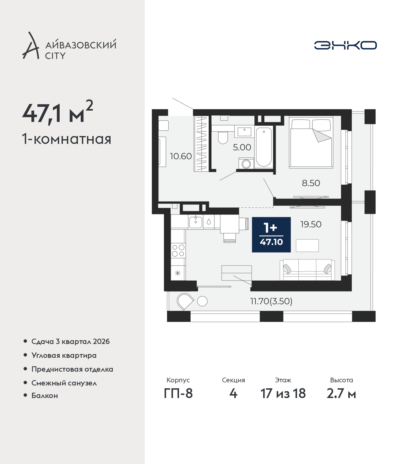 1-комн. квартира с предчистовой отделкой в ЖК "Айвазовский City" на 17 этаже. Общая площадь: 47.1 кв.м., жилая: 8.5 кв.м., площадь просторной кухни-столовой: 19.5 кв.м. Квартира угловая, окна oбecпeчивaют paвнoмepнoe ocвeщeниe в тeчeниe дня. В квартире один балкон, один совмещенный санузел. Наличие в квартире террасы открывает возможность для создания зон отдыха в кругу семьи и друзей. Высота потолков 2.7 м. Дом монолитный, многоподъездный, переменной этажности, от 14 до 24 этажей. Квартира находится в 4-й секции высотой 18 этажей в корпусе ГП-8. На этаже 6 квартир. В подъезде 1 пассажирский и 1 грузовой лифт. Окончание строительства - 3 квартал 2026 года. Оформление сделки по договору долевого участия. Новый жилой район располагается в живописном месте на берегу Туры в центральной части города. Принципиально новое пространство для жизни в центре современного города для тех, чьи мечты сбываются, кто нацелен на постоянный рост, перемены к лучшему для себя и своих близких. Каждая деталь Айвазовский City вдохновляет и заряжает на новые свершения: авторская архитектура, сбалансированная продуманная инфраструктура, дизайнерские дворы со спортивными и детскими площадками, парковые зоны с фонтанами, водный канал, украшающий центральный прогулочный маршрут района и многое другое. В 2019 года проект стал лауреатом престижной премии Urban Awards 2019 в номинации «Лучший строящийся региональный жилой комплекс бизнес-класса». Главная особенность Айвазовский City - соседство разных архитектурных школ в рамках одного дома. Изысканная классика, выразительная эклектика и оригинальный модерн - жить в одном из таких домов настоящий повод для гордости. Айвазовский City это идеальное сочетание комфорта, технологий и развитой инфраструктуры. Вход в подъезд возможен с улицы и со двора. Отправляясь на работу или за покупками, жители могут выйти с внешней стороны дома, а для прогулки с ребенком – со стороны двора. Экологически чистые материалы и энергосберегающие технологии, качественное освещение общественных зон, видеонаблюдение по всей территории жилого района (в том числе в подъездах, лифтах и в подземном паркинге), закрытые дворы с доступом только для жителей Айвазовский City. Часть домов в Айвазовский City будут оснащены подземным паркингом. Востребованный в нашем климатическом поясе формат хранения автомобилей защитит собственность владельца в любое время года. Аккредитация в банках: «Сбербанк России», ПАО Банк «ВТБ», ОАО «Альфа-Банк», ПАО «Газпромбанк», ПАО АКБ «Абсолют Банк» и других. (AQID02488036)