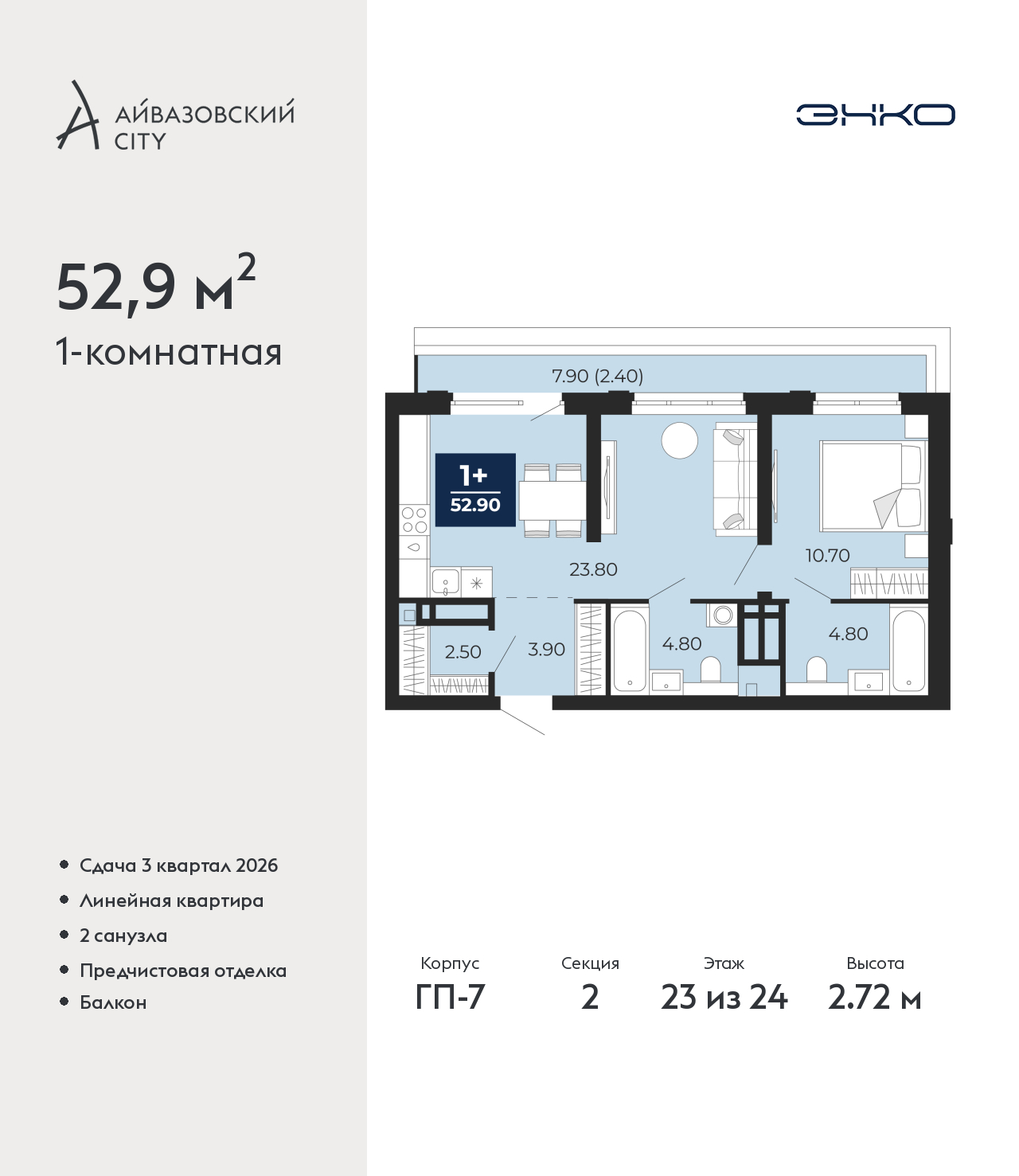 1-комн. квартира с предчистовой отделкой в ЖК "Айвазовский City" на 23 этаже. Общая площадь: 52.9 кв.м., жилая: 10.7 кв.м., площадь просторной кухни-столовой: 23.8 кв.м. Все окна выходят на одну сторону. В квартире один балкон, два совмещенных санузла. Наличие террасы в квартире дает возможность для обустройства дополнительной площади. Высота потолков 2.72 м. Дом монолитный, многоподъездный, переменной этажности, от 9 до 24 этажей. Квартира находится во 2-й секции высотой 24 этажа в корпусе ГП-7. На этаже 7 квартир. В подъезде 1 пассажирский и 2 грузовых лифта. Окончание строительства - 3 квартал 2026 года. Оформление сделки по договору долевого участия. Новый жилой район располагается в живописном месте на берегу Туры в центральной части города. Принципиально новое пространство для жизни в центре современного города для тех, чьи мечты сбываются, кто нацелен на постоянный рост, перемены к лучшему для себя и своих близких. Каждая деталь Айвазовский City вдохновляет и заряжает на новые свершения: авторская архитектура, сбалансированная продуманная инфраструктура, дизайнерские дворы со спортивными и детскими площадками, парковые зоны с фонтанами, водный канал, украшающий центральный прогулочный маршрут района и многое другое. В 2019 года проект стал лауреатом престижной премии Urban Awards 2019 в номинации «Лучший строящийся региональный жилой комплекс бизнес-класса». Главная особенность Айвазовский City - соседство разных архитектурных школ в рамках одного дома. Изысканная классика, выразительная эклектика и оригинальный модерн - жить в одном из таких домов настоящий повод для гордости. Айвазовский City это идеальное сочетание комфорта, технологий и развитой инфраструктуры. Вход в подъезд возможен с улицы и со двора. Отправляясь на работу или за покупками, жители могут выйти с внешней стороны дома, а для прогулки с ребенком – со стороны двора. Экологически чистые материалы и энергосберегающие технологии, качественное освещение общественных зон, видеонаблюдение по всей территории жилого района (в том числе в подъездах, лифтах и в подземном паркинге), закрытые дворы с доступом только для жителей Айвазовский City. Часть домов в Айвазовский City будут оснащены подземным паркингом. Востребованный в нашем климатическом поясе формат хранения автомобилей защитит собственность владельца в любое время года. Аккредитация в банках: ПАО «Газпромбанк», «Сбербанк России», ПАО Банк «ВТБ», ОАО «Альфа-Банк», ПАО «Совкомбанк» и других. (AQID02497744)