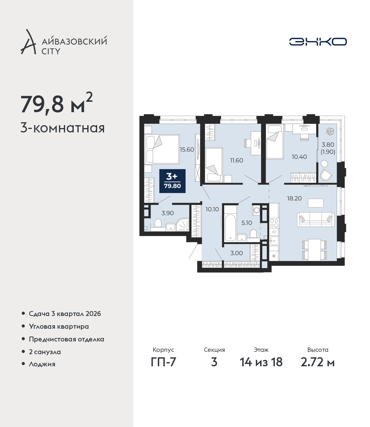 Продается 3-комн. квартира с предчистовой отделкой в ЖК "Айвазовский City" на 14 этаже. Общая площадь: 79.8 кв.м., жилая: 37.6 кв.м., площадь просторной кухни-столовой: 18.2 кв.м. Квартира угловая, идеально подойдет любителям тишины и панорамных видов. В квартире одна лоджия, два совмещенных санузла. Высота потолков 2.72 м. Дом монолитный, многоподъездный, переменной этажности, от 9 до 24 этажей. Квартира находится в 3-й секции высотой 18 этажей в корпусе ГП-7. На этаже 5 квартир. В подъезде 1 пассажирский и 2 грузовых лифта. Окончание строительства - 3 квартал 2026 года. Оформление сделки по договору долевого участия. Новый жилой район располагается в живописном месте на берегу Туры в центральной части города. Принципиально новое пространство для жизни в центре современного города для тех, чьи мечты сбываются, кто нацелен на постоянный рост, перемены к лучшему для себя и своих близких. Каждая деталь Айвазовский City вдохновляет и заряжает на новые свершения: авторская архитектура, сбалансированная продуманная инфраструктура, дизайнерские дворы со спортивными и детскими площадками, парковые зоны с фонтанами, водный канал, украшающий центральный прогулочный маршрут района и многое другое. В 2019 года проект стал лауреатом престижной премии Urban Awards 2019 в номинации «Лучший строящийся региональный жилой комплекс бизнес-класса». Главная особенность Айвазовский City - соседство разных архитектурных школ в рамках одного дома. Изысканная классика, выразительная эклектика и оригинальный модерн - жить в одном из таких домов настоящий повод для гордости. Айвазовский City это идеальное сочетание комфорта, технологий и развитой инфраструктуры. Вход в подъезд возможен с улицы и со двора. Отправляясь на работу или за покупками, жители могут выйти с внешней стороны дома, а для прогулки с ребенком – со стороны двора. Экологически чистые материалы и энергосберегающие технологии, качественное освещение общественных зон, видеонаблюдение по всей территории жилого района (в том числе в подъездах, лифтах и в подземном паркинге), закрытые дворы с доступом только для жителей Айвазовский City. Часть домов в Айвазовский City будут оснащены подземным паркингом. Востребованный в нашем климатическом поясе формат хранения автомобилей защитит собственность владельца в любое время года. Аккредитация в банках: ПАО «Газпромбанк», ПАО Банк «ВТБ», ОАО «Альфа-Банк», «Сбербанк России», ПАО Банк «ФК Открытие» и других. (AQID02497832)