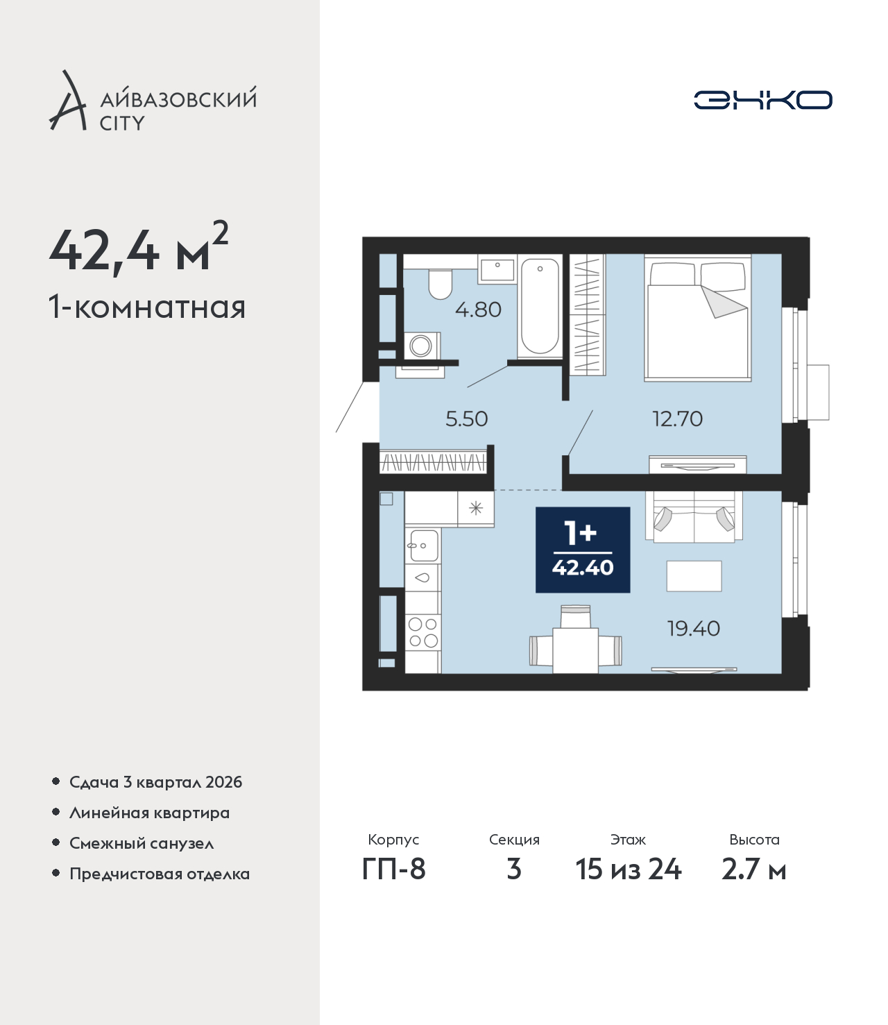 Однокомнатная квартира от застройщика с предчистовой отделкой в ЖК "Айвазовский City" на 15 этаже. Общая площадь: 42.4 кв.м., жилая: 12.7 кв.м., площадь просторной кухни-столовой: 19.4 кв.м. Все окна выходят на одну сторону. В квартире один совмещенный санузел. Высота потолков 2.7 м. Дом монолитный, многоподъездный, переменной этажности, от 14 до 24 этажей. Квартира находится в 3-й секции высотой 24 этажа в корпусе ГП-8. На этаже 7 квартир. В подъезде 1 пассажирский и 1 грузовой лифт. Окончание строительства - 3 квартал 2026 года. Оформление сделки по договору долевого участия. Новый жилой район располагается в живописном месте на берегу Туры в центральной части города. Принципиально новое пространство для жизни в центре современного города для тех, чьи мечты сбываются, кто нацелен на постоянный рост, перемены к лучшему для себя и своих близких. Каждая деталь Айвазовский City вдохновляет и заряжает на новые свершения: авторская архитектура, сбалансированная продуманная инфраструктура, дизайнерские дворы со спортивными и детскими площадками, парковые зоны с фонтанами, водный канал, украшающий центральный прогулочный маршрут района и многое другое. В 2019 года проект стал лауреатом престижной премии Urban Awards 2019 в номинации «Лучший строящийся региональный жилой комплекс бизнес-класса». Главная особенность Айвазовский City - соседство разных архитектурных школ в рамках одного дома. Изысканная классика, выразительная эклектика и оригинальный модерн - жить в одном из таких домов настоящий повод для гордости. Айвазовский City это идеальное сочетание комфорта, технологий и развитой инфраструктуры. Вход в подъезд возможен с улицы и со двора. Отправляясь на работу или за покупками, жители могут выйти с внешней стороны дома, а для прогулки с ребенком – со стороны двора. Экологически чистые материалы и энергосберегающие технологии, качественное освещение общественных зон, видеонаблюдение по всей территории жилого района (в том числе в подъездах, лифтах и в подземном паркинге), закрытые дворы с доступом только для жителей Айвазовский City. Часть домов в Айвазовский City будут оснащены подземным паркингом. Востребованный в нашем климатическом поясе формат хранения автомобилей защитит собственность владельца в любое время года. Аккредитация в банках: ОАО «Альфа-Банк», ПАО Банк «ВТБ», ПАО «Газпромбанк», «Сбербанк России», ПАО АКБ «Абсолют Банк» и других. (AQID02501211)