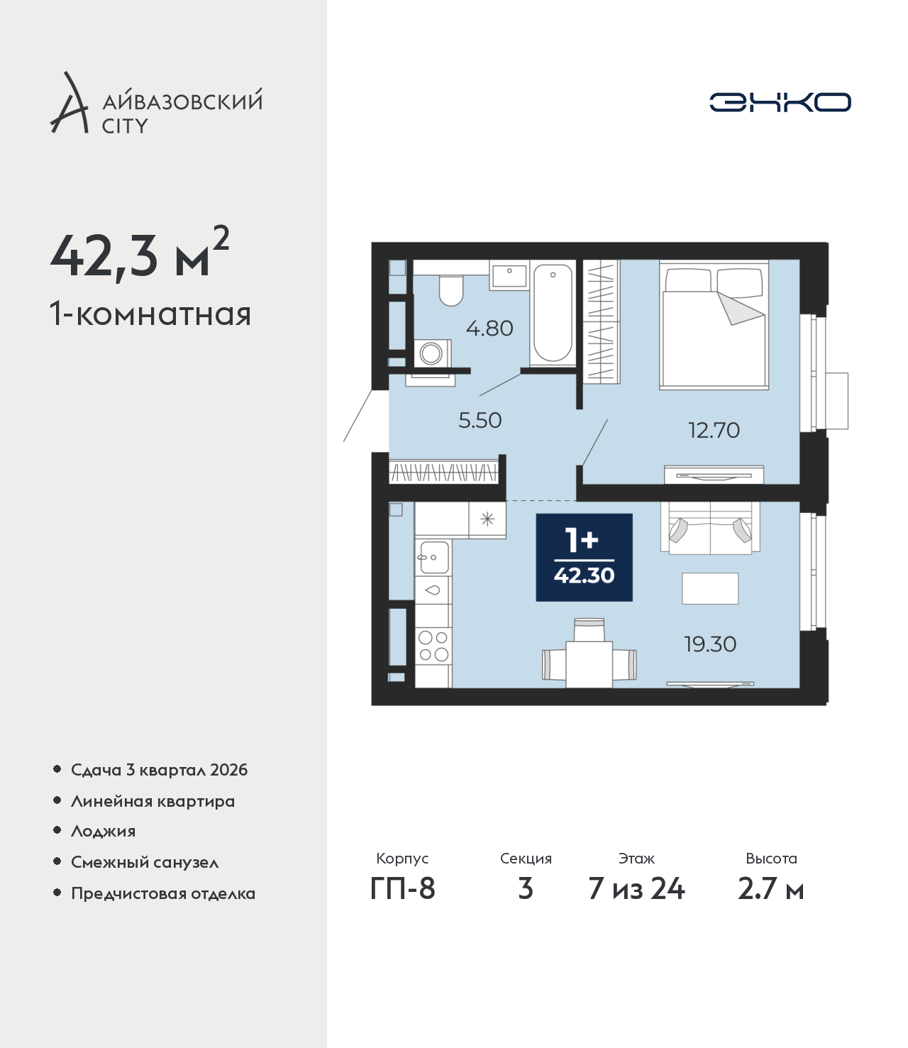 - Общая площадь 42.3 м²