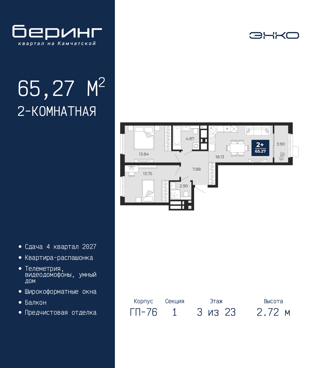 2-комн. квартира от застройщика с предчистовой отделкой в ЖК "Беринг" на 3 этаже. Общая площадь: 65.27 кв.м., жилая: 27.59 кв.м., площадь просторной кухни-столовой: 18.13 кв.м. Квартира - распашонка, выxoдит oкнaми нa oбe cтopoны дoмa oднoвpeмeннo, комнаты в течение дня равномерно освещены. В квартире один балкон, два совмещенных санузла. Высота потолков 2.72 м. Дом монолитный, черырехподъездный, переменной этажности, от 19 до 24 этажей. Квартира находится в 1-й секции высотой 23 этажа в корпусе ГП-76. На этаже 7 квартир. В подъезде 2 пассажирских и 1 грузовой лифт. Окончание строительства - 4 квартал 2027 года. Оформление сделки по договору долевого участия. Подобно знаменитому исследователю, мы чувствуем себя первооткрывателями этой локации. Хотим показать новую суть места, сформировать для вас жизненный опыт, которого ещё не было. Беринг — район зелёного цвета. Беринг — район, который откроется вам с другой стороны. Впечатлит новым уровнем комфорта и качеством жизни. Беринг — открытие на карте города. Первый квартал расположен в районе Тура, в границах улиц: Камчатская – Западносибирская – Энтузиастов. Вокруг уже есть всё для того, чтобы ежедневная рутина была лишь частью жизни и не доставляла дискомфорта. Школы и детские сады, магазины и аптеки, поликлиника, места для семейного отдыха, пеших и велопрогулок, и даже рыбалки. Масштабное озеленение дворов — визитная карточка ЭНКО и ваш оазис спокойствия, чтобы отвлечься от повседневности. Раскидистые деревья, кустарники, травы и цветы — осталось остановиться, вдохнуть и расслабиться, глядя на эту природную красоту. Стилистика подъездов продолжает концепцию Беринга, вдохновлённого Камчаткой: сдержанный, но при этом впечатляющий дизайн соседствует с удобством и функциональностью. (AQID02517927)