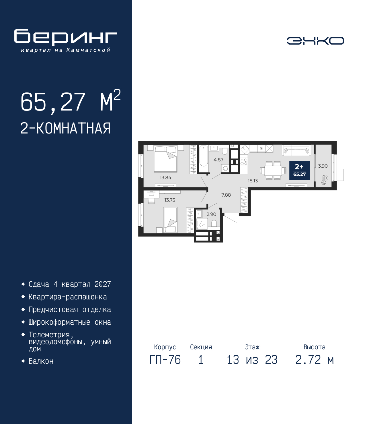 Просторная 2-комн. квартира с предчистовой отделкой в ЖК "Беринг" на 13 этаже. Общая площадь: 65.27 кв.м., жилая: 27.59 кв.м., площадь просторной кухни-столовой: 18.13 кв.м. Квартира - распашонка, без проходных комнат, окна выходят на paзные стороны дома. В квартире один балкон, два совмещенных санузла. Высота потолков 2.72 м. Дом монолитный, черырехподъездный, переменной этажности, от 19 до 24 этажей. Квартира находится в 1-й секции высотой 23 этажа в корпусе ГП-76. На этаже 7 квартир. В подъезде 2 пассажирских и 1 грузовой лифт. Окончание строительства - 4 квартал 2027 года. Оформление сделки по договору долевого участия. Подобно знаменитому исследователю, мы чувствуем себя первооткрывателями этой локации. Хотим показать новую суть места, сформировать для вас жизненный опыт, которого ещё не было. Беринг — район зелёного цвета. Беринг — район, который откроется вам с другой стороны. Впечатлит новым уровнем комфорта и качеством жизни. Беринг — открытие на карте города. Первый квартал расположен в районе Тура, в границах улиц: Камчатская – Западносибирская – Энтузиастов. Вокруг уже есть всё для того, чтобы ежедневная рутина была лишь частью жизни и не доставляла дискомфорта. Школы и детские сады, магазины и аптеки, поликлиника, места для семейного отдыха, пеших и велопрогулок, и даже рыбалки. Масштабное озеленение дворов — визитная карточка ЭНКО и ваш оазис спокойствия, чтобы отвлечься от повседневности. Раскидистые деревья, кустарники, травы и цветы — осталось остановиться, вдохнуть и расслабиться, глядя на эту природную красоту. Стилистика подъездов продолжает концепцию Беринга, вдохновлённого Камчаткой: сдержанный, но при этом впечатляющий дизайн соседствует с удобством и функциональностью. (AQID02518025)