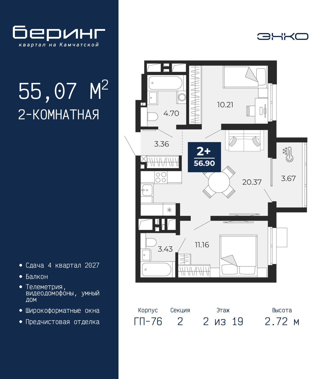 Просторная 2-комн. квартира с предчистовой отделкой в ЖК "Беринг" на 2 этаже. Общая площадь: 55.07 кв.м., жилая: 21.37 кв.м., площадь просторной кухни-столовой: 20.37 кв.м. Комнаты изолированные, все окна выходят на одну сторону. В квартире один балкон, два совмещенных санузла. Высота потолков 2.72 м. Дом монолитный, черырехподъездный, переменной этажности, от 19 до 24 этажей. Квартира находится во 2-й секции высотой 19 этажей в корпусе ГП-76. На этаже 8 квартир. В подъезде 1 пассажирский и 1 грузовой лифт. Окончание строительства - 4 квартал 2027 года. Оформление сделки по договору долевого участия. Подобно знаменитому исследователю, мы чувствуем себя первооткрывателями этой локации. Хотим показать новую суть места, сформировать для вас жизненный опыт, которого ещё не было. Беринг — район зелёного цвета. Беринг — район, который откроется вам с другой стороны. Впечатлит новым уровнем комфорта и качеством жизни. Беринг — открытие на карте города. Первый квартал расположен в районе Тура, в границах улиц: Камчатская – Западносибирская – Энтузиастов. Вокруг уже есть всё для того, чтобы ежедневная рутина была лишь частью жизни и не доставляла дискомфорта. Школы и детские сады, магазины и аптеки, поликлиника, места для семейного отдыха, пеших и велопрогулок, и даже рыбалки. Масштабное озеленение дворов — визитная карточка ЭНКО и ваш оазис спокойствия, чтобы отвлечься от повседневности. Раскидистые деревья, кустарники, травы и цветы — осталось остановиться, вдохнуть и расслабиться, глядя на эту природную красоту. Стилистика подъездов продолжает концепцию Беринга, вдохновлённого Камчаткой: сдержанный, но при этом впечатляющий дизайн соседствует с удобством и функциональностью. (AQID02518045)