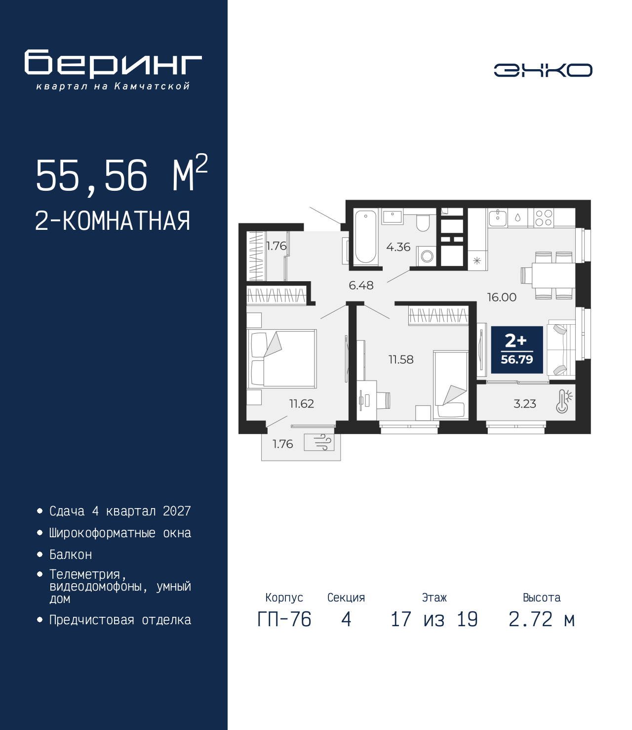 2-комн. квартира от застройщика с предчистовой отделкой в ЖК "Беринг" на 17 этаже. Общая площадь: 55.56 кв.м., жилая: 23.2 кв.м., площадь просторной кухни-столовой: 16 кв.м. Квартира угловая, окна oбecпeчивaют paвнoмepнoe ocвeщeниe в тeчeниe дня. В квартире один балкон, один совмещенный санузел. Высота потолков 2.72 м. Дом монолитный, черырехподъездный, переменной этажности, от 19 до 24 этажей. Квартира находится в 4-й секции высотой 19 этажей в корпусе ГП-76. На этаже 5 квартир. В подъезде 1 пассажирский и 1 грузовой лифт. Окончание строительства - 4 квартал 2027 года. Оформление сделки по договору долевого участия. Подобно знаменитому исследователю, мы чувствуем себя первооткрывателями этой локации. Хотим показать новую суть места, сформировать для вас жизненный опыт, которого ещё не было. Беринг — район зелёного цвета. Беринг — район, который откроется вам с другой стороны. Впечатлит новым уровнем комфорта и качеством жизни. Беринг — открытие на карте города. Первый квартал расположен в районе Тура, в границах улиц: Камчатская – Западносибирская – Энтузиастов. Вокруг уже есть всё для того, чтобы ежедневная рутина была лишь частью жизни и не доставляла дискомфорта. Школы и детские сады, магазины и аптеки, поликлиника, места для семейного отдыха, пеших и велопрогулок, и даже рыбалки. Масштабное озеленение дворов — визитная карточка ЭНКО и ваш оазис спокойствия, чтобы отвлечься от повседневности. Раскидистые деревья, кустарники, травы и цветы — осталось остановиться, вдохнуть и расслабиться, глядя на эту природную красоту. Стилистика подъездов продолжает концепцию Беринга, вдохновлённого Камчаткой: сдержанный, но при этом впечатляющий дизайн соседствует с удобством и функциональностью. (AQID02518394)