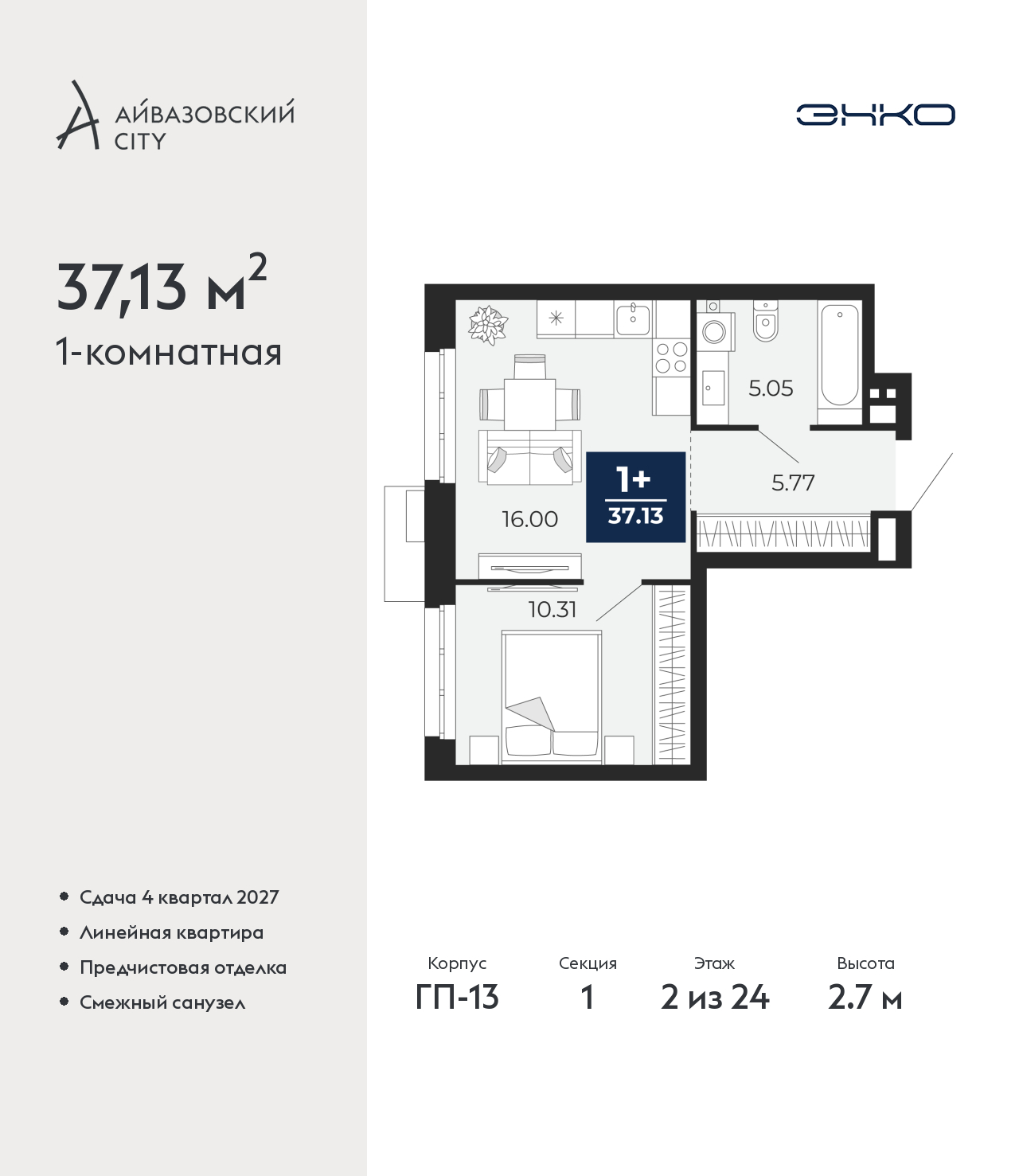 - Общая площадь 37.13 м²
