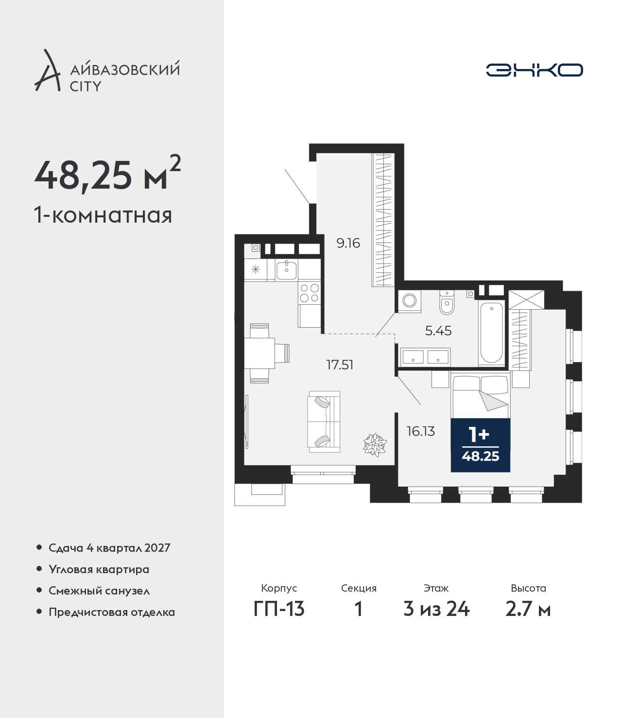 Просторная 1-комн. квартира с предчистовой отделкой в ЖК "Айвазовский City" на 3 этаже. Общая площадь: 48.25 кв.м., жилая: 16.13 кв.м., площадь просторной кухни-столовой: 17.51 кв.м. Угловая квартира, идеально подойдет любителям тишины и панорамных видов. В квартире один совмещенный санузел. Высота потолков 2.7 м. Дом монолитный, многоподъездный, высотой 24 этажа. Квартира находится в 1-й секции в корпусе ГП-13. На этаже 2 квартиры. Окончание строительства - 4 квартал 2027 года. Оформление сделки по договору долевого участия. Новый жилой район располагается в живописном месте на берегу Туры в центральной части города. Принципиально новое пространство для жизни в центре современного города для тех, чьи мечты сбываются, кто нацелен на постоянный рост, перемены к лучшему для себя и своих близких. Каждая деталь Айвазовский City вдохновляет и заряжает на новые свершения: авторская архитектура, сбалансированная продуманная инфраструктура, дизайнерские дворы со спортивными и детскими площадками, парковые зоны с фонтанами, водный канал, украшающий центральный прогулочный маршрут района и многое другое. В 2019 года проект стал лауреатом престижной премии Urban Awards 2019 в номинации «Лучший строящийся региональный жилой комплекс бизнес-класса». Главная особенность Айвазовский City - соседство разных архитектурных школ в рамках одного дома. Изысканная классика, выразительная эклектика и оригинальный модерн - жить в одном из таких домов настоящий повод для гордости. Айвазовский City это идеальное сочетание комфорта, технологий и развитой инфраструктуры. Вход в подъезд возможен с улицы и со двора. Отправляясь на работу или за покупками, жители могут выйти с внешней стороны дома, а для прогулки с ребенком – со стороны двора. Экологически чистые материалы и энергосберегающие технологии, качественное освещение общественных зон, видеонаблюдение по всей территории жилого района (в том числе в подъездах, лифтах и в подземном паркинге), закрытые дворы с доступом только для жителей Айвазовский City. Часть домов в Айвазовский City будут оснащены подземным паркингом. Востребованный в нашем климатическом поясе формат хранения автомобилей защитит собственность владельца в любое время года. Аккредитация в банках: «Сбербанк России», ПАО Банк «ВТБ», ПАО «Газпромбанк», ОАО «Альфа-Банк», АО "ДОМ.РФ" и других. (AQID02520687)