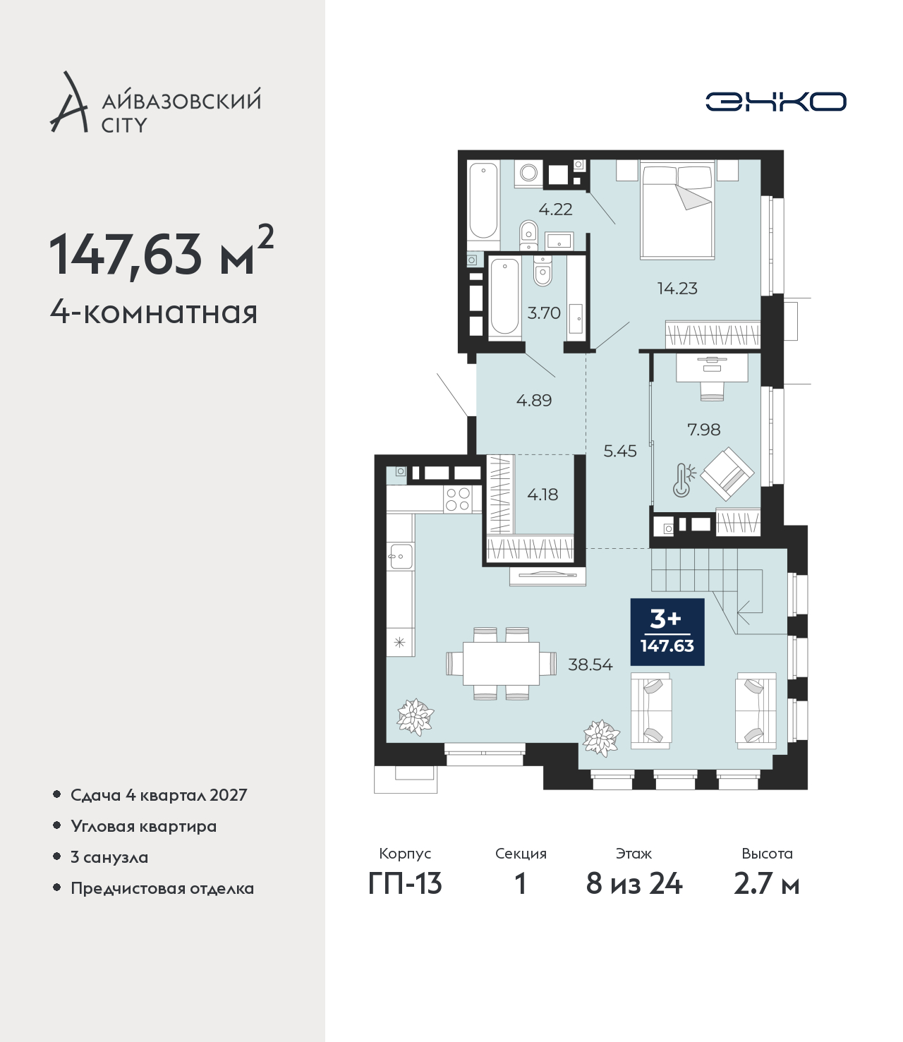 Просторная 4-комн. квартира с предчистовой отделкой в ЖК "Айвазовский City" на 8 этаже. 2-уровневая квартира с возможностью разделения гостевой зоны и личного пространства. Общая площадь: 147.63 кв.м., жилая: 44.21 кв.м., площадь просторной кухни-столовой: 38.54 кв.м. Квартира угловая, окна oбecпeчивaют paвнoмepнoe ocвeщeниe в тeчeниe дня. В квартире два совмещенных и один раздельный санузел. Высота потолков 2.7 м. Дом монолитный, многоподъездный, высотой 24 этажа. Квартира находится в 1-й секции в корпусе ГП-13. На этаже 2 квартиры. Окончание строительства - 4 квартал 2027 года. Оформление сделки по договору долевого участия. Новый жилой район располагается в живописном месте на берегу Туры в центральной части города. Принципиально новое пространство для жизни в центре современного города для тех, чьи мечты сбываются, кто нацелен на постоянный рост, перемены к лучшему для себя и своих близких. Каждая деталь Айвазовский City вдохновляет и заряжает на новые свершения: авторская архитектура, сбалансированная продуманная инфраструктура, дизайнерские дворы со спортивными и детскими площадками, парковые зоны с фонтанами, водный канал, украшающий центральный прогулочный маршрут района и многое другое. В 2019 года проект стал лауреатом престижной премии Urban Awards 2019 в номинации «Лучший строящийся региональный жилой комплекс бизнес-класса». Главная особенность Айвазовский City - соседство разных архитектурных школ в рамках одного дома. Изысканная классика, выразительная эклектика и оригинальный модерн - жить в одном из таких домов настоящий повод для гордости. Айвазовский City это идеальное сочетание комфорта, технологий и развитой инфраструктуры. Вход в подъезд возможен с улицы и со двора. Отправляясь на работу или за покупками, жители могут выйти с внешней стороны дома, а для прогулки с ребенком – со стороны двора. Экологически чистые материалы и энергосберегающие технологии, качественное освещение общественных зон, видеонаблюдение по всей территории жилого района (в том числе в подъездах, лифтах и в подземном паркинге), закрытые дворы с доступом только для жителей Айвазовский City. Часть домов в Айвазовский City будут оснащены подземным паркингом. Востребованный в нашем климатическом поясе формат хранения автомобилей защитит собственность владельца в любое время года. Аккредитация в банках: ПАО Банк «ВТБ», «Сбербанк России», ОАО «Альфа-Банк», ПАО «Газпромбанк», ПАО АКБ «Абсолют Банк» и других. (AQID02520779)