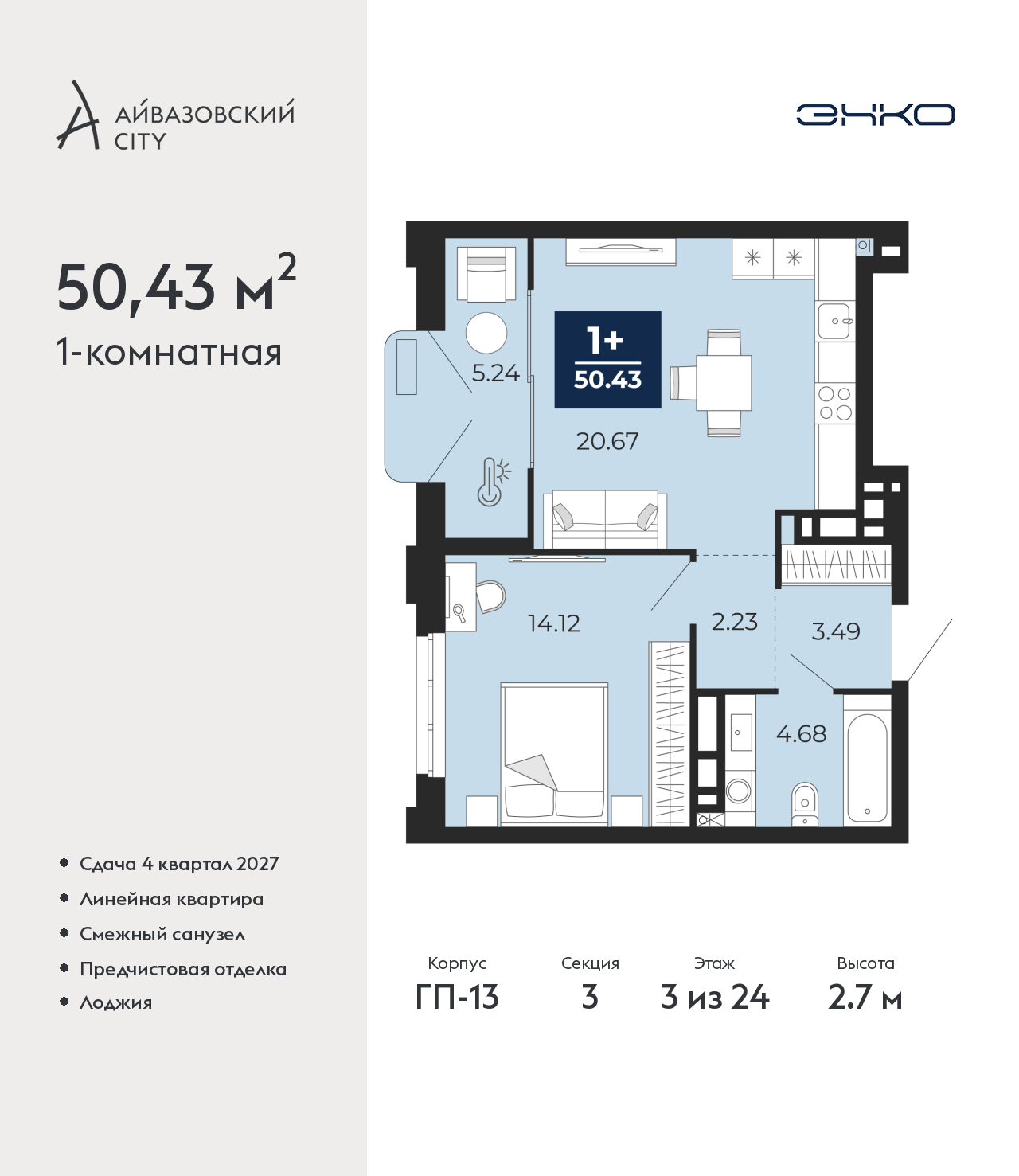 Однокомнатная квартира от застройщика с предчистовой отделкой в ЖК "Айвазовский City" на 3 этаже. Общая площадь: 50.43 кв.м., жилая: 14.12 кв.м., площадь просторной кухни-столовой: 20.67 кв.м. Все окна выходят на одну сторону. В квартире одна лоджия, один совмещенный санузел. Высота потолков 2.7 м. Дом монолитный, многоподъездный, высотой 24 этажа. Квартира находится в 3-й секции в корпусе ГП-13. На этаже 9 квартир. В подъезде 1 пассажирский и 1 грузовой лифт. Окончание строительства - 4 квартал 2027 года. Оформление сделки по договору долевого участия. Новый жилой район располагается в живописном месте на берегу Туры в центральной части города. Принципиально новое пространство для жизни в центре современного города для тех, чьи мечты сбываются, кто нацелен на постоянный рост, перемены к лучшему для себя и своих близких. Каждая деталь Айвазовский City вдохновляет и заряжает на новые свершения: авторская архитектура, сбалансированная продуманная инфраструктура, дизайнерские дворы со спортивными и детскими площадками, парковые зоны с фонтанами, водный канал, украшающий центральный прогулочный маршрут района и многое другое. В 2019 года проект стал лауреатом престижной премии Urban Awards 2019 в номинации «Лучший строящийся региональный жилой комплекс бизнес-класса». Главная особенность Айвазовский City - соседство разных архитектурных школ в рамках одного дома. Изысканная классика, выразительная эклектика и оригинальный модерн - жить в одном из таких домов настоящий повод для гордости. Айвазовский City это идеальное сочетание комфорта, технологий и развитой инфраструктуры. Вход в подъезд возможен с улицы и со двора. Отправляясь на работу или за покупками, жители могут выйти с внешней стороны дома, а для прогулки с ребенком – со стороны двора. Экологически чистые материалы и энергосберегающие технологии, качественное освещение общественных зон, видеонаблюдение по всей территории жилого района (в том числе в подъездах, лифтах и в подземном паркинге), закрытые дворы с доступом только для жителей Айвазовский City. Часть домов в Айвазовский City будут оснащены подземным паркингом. Востребованный в нашем климатическом поясе формат хранения автомобилей защитит собственность владельца в любое время года. Аккредитация в банках: «Сбербанк России», ПАО Банк «ВТБ», ПАО «Газпромбанк», ОАО «Альфа-Банк», АО "ДОМ.РФ" и других. (AQID02521061)