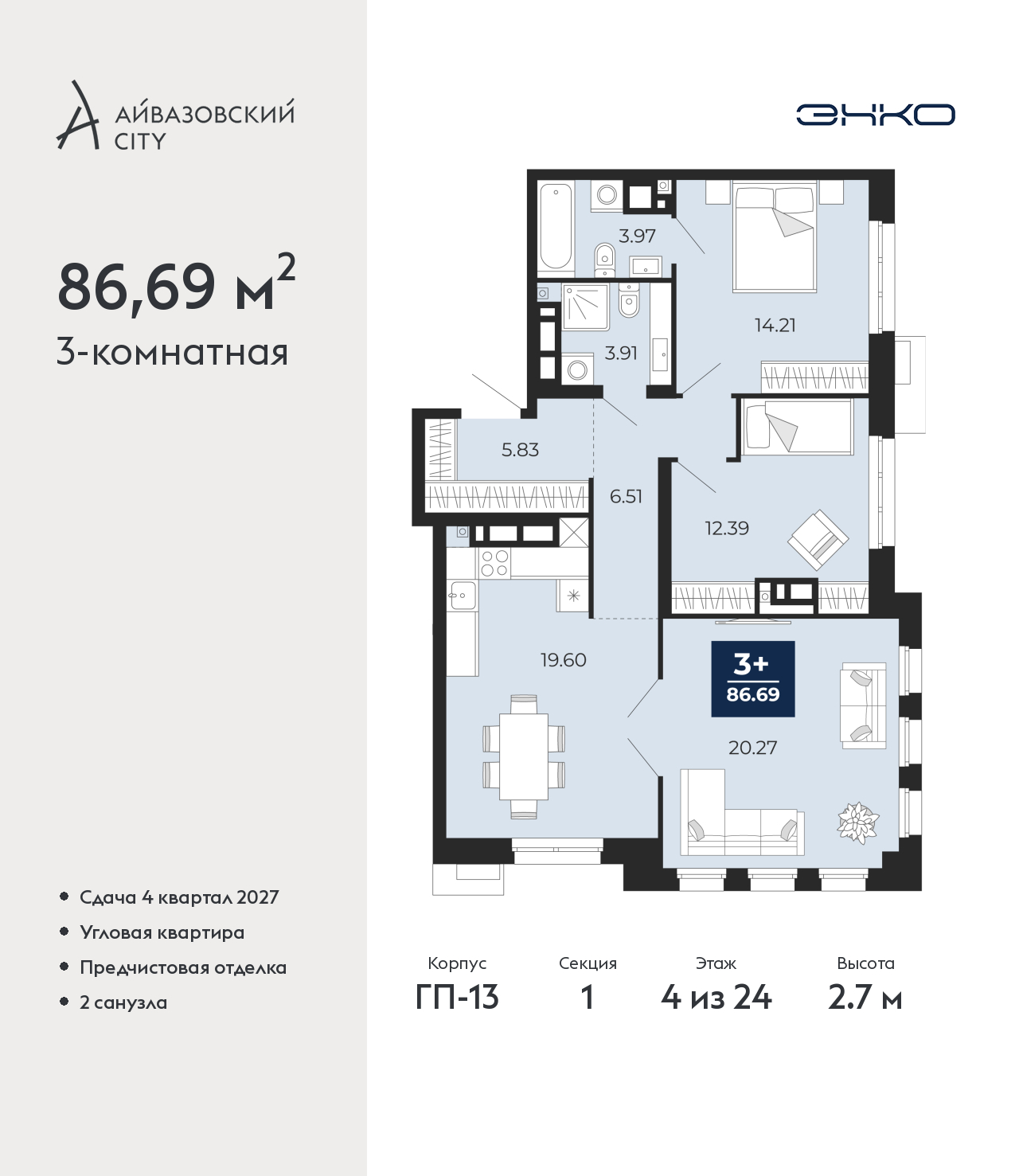 Просторная трехкомнатная квартира с предчистовой отделкой в ЖК "Айвазовский City" на 4 этаже. Общая площадь: 86.69 кв.м., жилая: 46.87 кв.м., площадь просторной кухни-столовой: 19.6 кв.м. Угловая квартира, идеально подойдет любителям тишины и панорамных видов. В квартире два совмещенных санузла. Высота потолков 2.7 м. Дом монолитный, многоподъездный, высотой 24 этажа. Квартира находится в 1-й секции в корпусе ГП-13. На этаже 2 квартиры. Окончание строительства - 4 квартал 2027 года. Оформление сделки по договору долевого участия. Новый жилой район располагается в живописном месте на берегу Туры в центральной части города. Принципиально новое пространство для жизни в центре современного города для тех, чьи мечты сбываются, кто нацелен на постоянный рост, перемены к лучшему для себя и своих близких. Каждая деталь Айвазовский City вдохновляет и заряжает на новые свершения: авторская архитектура, сбалансированная продуманная инфраструктура, дизайнерские дворы со спортивными и детскими площадками, парковые зоны с фонтанами, водный канал, украшающий центральный прогулочный маршрут района и многое другое. В 2019 года проект стал лауреатом престижной премии Urban Awards 2019 в номинации «Лучший строящийся региональный жилой комплекс бизнес-класса». Главная особенность Айвазовский City - соседство разных архитектурных школ в рамках одного дома. Изысканная классика, выразительная эклектика и оригинальный модерн - жить в одном из таких домов настоящий повод для гордости. Айвазовский City это идеальное сочетание комфорта, технологий и развитой инфраструктуры. Вход в подъезд возможен с улицы и со двора. Отправляясь на работу или за покупками, жители могут выйти с внешней стороны дома, а для прогулки с ребенком – со стороны двора. Экологически чистые материалы и энергосберегающие технологии, качественное освещение общественных зон, видеонаблюдение по всей территории жилого района (в том числе в подъездах, лифтах и в подземном паркинге), закрытые дворы с доступом только для жителей Айвазовский City. Часть домов в Айвазовский City будут оснащены подземным паркингом. Востребованный в нашем климатическом поясе формат хранения автомобилей защитит собственность владельца в любое время года. Аккредитация в банках: «Сбербанк России», ПАО «Газпромбанк», ОАО «Альфа-Банк», ПАО Банк «ВТБ», ПАО «Промсвязьбанк» и других. (AQID02521150)