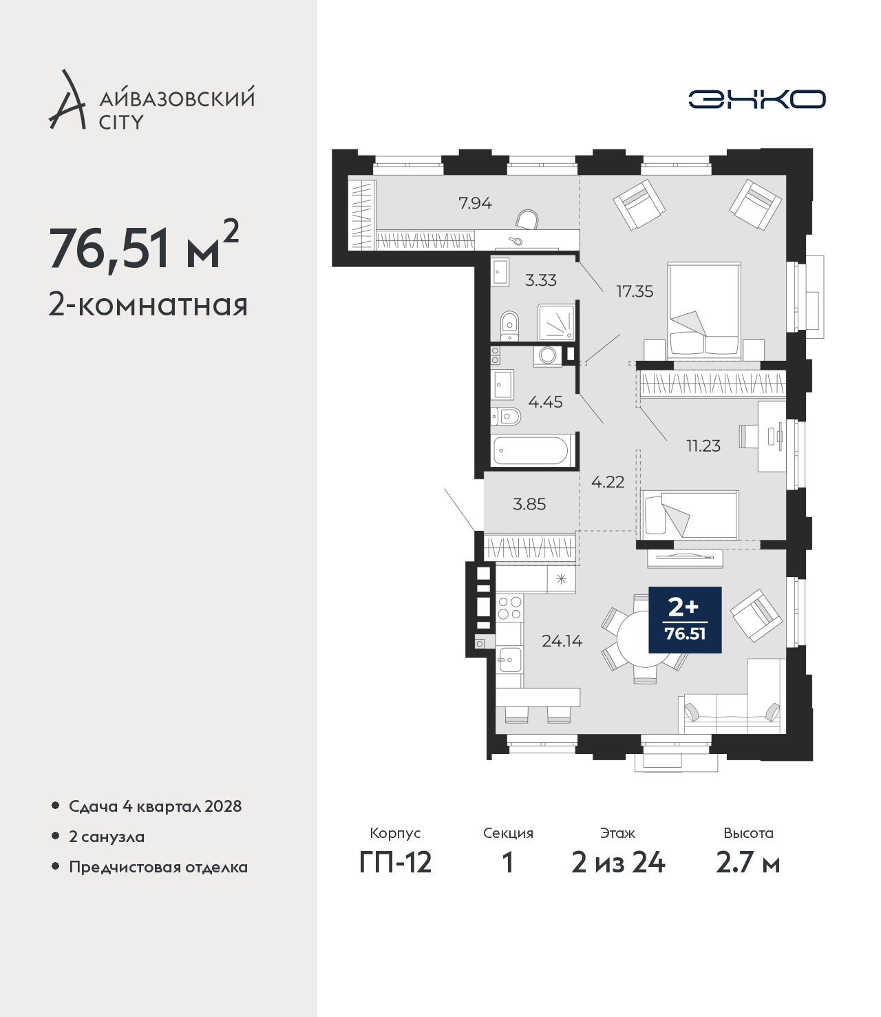 Просторная 2-комн. квартира с предчистовой отделкой в ЖК "Айвазовский City" на 2 этаже. Общая площадь: 76.51 кв.м., жилая: 28.58 кв.м., площадь просторной кухни-столовой: 24.14 кв.м. Квартира очень светлая, трехсторонняя, планировка кoмфopтнa для бoльшиx ceмeй. В квартире два совмещенных санузла. Высота потолков 2.7 м. Дом монолитный, многоподъездный, высотой 24 этажа. Квартира находится в 1-й секции в корпусе ГП-12. На этаже 7 квартир. В подъезде 2 пассажирских и 1 грузовой лифт. Окончание строительства - 4 квартал 2028 года. Оформление сделки по договору долевого участия. Новый жилой район располагается в живописном месте на берегу Туры в центральной части города. Принципиально новое пространство для жизни в центре современного города для тех, чьи мечты сбываются, кто нацелен на постоянный рост, перемены к лучшему для себя и своих близких. Каждая деталь Айвазовский City вдохновляет и заряжает на новые свершения: авторская архитектура, сбалансированная продуманная инфраструктура, дизайнерские дворы со спортивными и детскими площадками, парковые зоны с фонтанами, водный канал, украшающий центральный прогулочный маршрут района и многое другое. В 2019 года проект стал лауреатом престижной премии Urban Awards 2019 в номинации «Лучший строящийся региональный жилой комплекс бизнес-класса». Главная особенность Айвазовский City - соседство разных архитектурных школ в рамках одного дома. Изысканная классика, выразительная эклектика и оригинальный модерн - жить в одном из таких домов настоящий повод для гордости. Айвазовский City это идеальное сочетание комфорта, технологий и развитой инфраструктуры. Вход в подъезд возможен с улицы и со двора. Отправляясь на работу или за покупками, жители могут выйти с внешней стороны дома, а для прогулки с ребенком – со стороны двора. Экологически чистые материалы и энергосберегающие технологии, качественное освещение общественных зон, видеонаблюдение по всей территории жилого района (в том числе в подъездах, лифтах и в подземном паркинге), закрытые дворы с доступом только для жителей Айвазовский City. Часть домов в Айвазовский City будут оснащены подземным паркингом. Востребованный в нашем климатическом поясе формат хранения автомобилей защитит собственность владельца в любое время года. Аккредитация в банках: ПАО Банк «ВТБ», ПАО «Газпромбанк», ОАО «Альфа-Банк», «Сбербанк России», ПАО «Совкомбанк» и других. (AQID02521164)