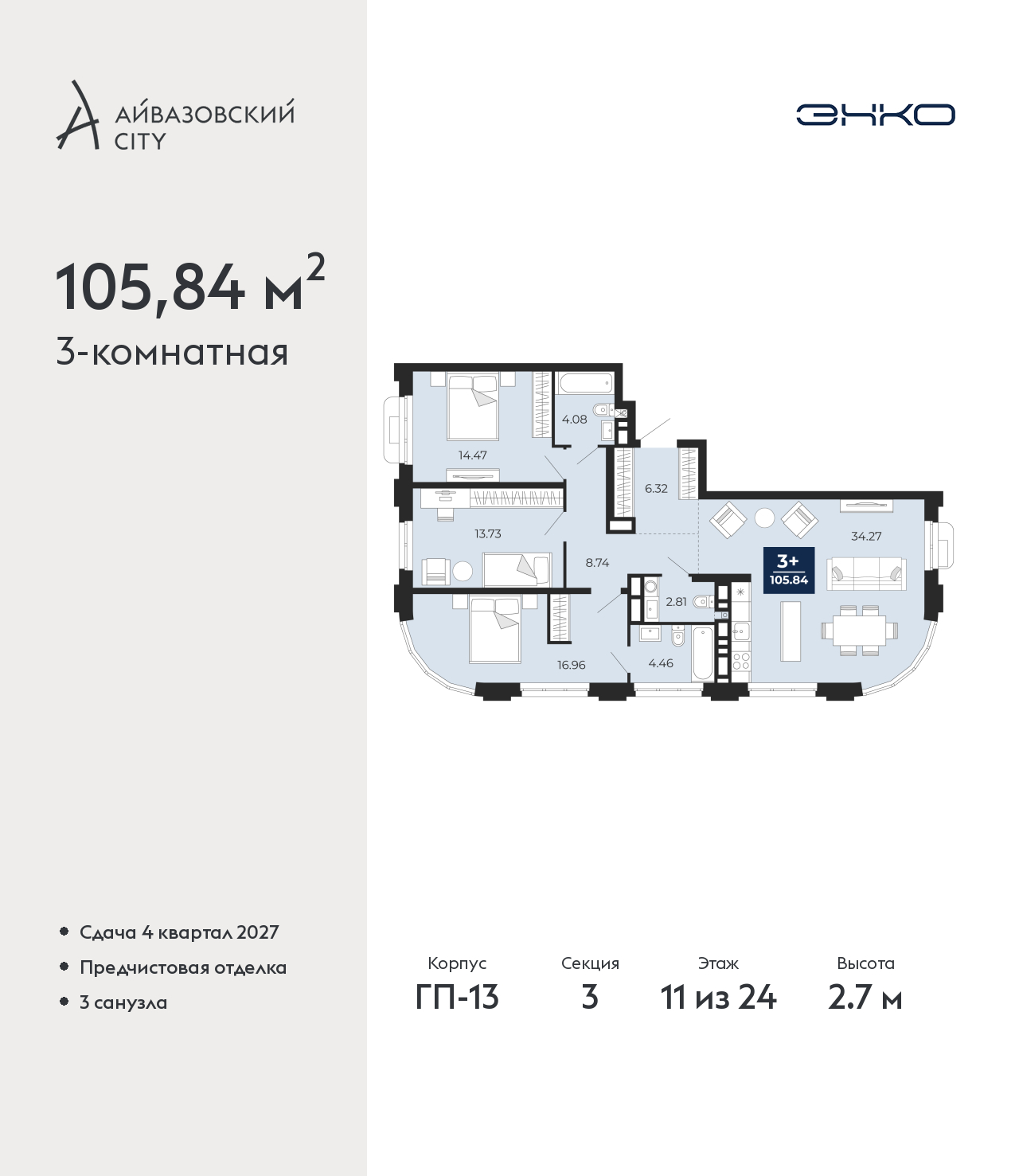 Трехкомнатная квартира с предчистовой отделкой в ЖК "Айвазовский City" на 11 этаже. Общая площадь: 105.84 кв.м., жилая: 45.16 кв.м., площадь просторной кухни-столовой: 34.27 кв.м. Квартира без проходных комнат, окна выходят нa три cтopoны дома. В квартире два совмещенных и один раздельный санузел. Высота потолков 2.7 м. Дом монолитный, многоподъездный, высотой 24 этажа. Квартира находится в 3-й секции в корпусе ГП-13. На этаже 9 квартир. В подъезде 1 пассажирский и 1 грузовой лифт. Окончание строительства - 4 квартал 2027 года. Оформление сделки по договору долевого участия. Новый жилой район располагается в живописном месте на берегу Туры в центральной части города. Принципиально новое пространство для жизни в центре современного города для тех, чьи мечты сбываются, кто нацелен на постоянный рост, перемены к лучшему для себя и своих близких. Каждая деталь Айвазовский City вдохновляет и заряжает на новые свершения: авторская архитектура, сбалансированная продуманная инфраструктура, дизайнерские дворы со спортивными и детскими площадками, парковые зоны с фонтанами, водный канал, украшающий центральный прогулочный маршрут района и многое другое. В 2019 года проект стал лауреатом престижной премии Urban Awards 2019 в номинации «Лучший строящийся региональный жилой комплекс бизнес-класса». Главная особенность Айвазовский City - соседство разных архитектурных школ в рамках одного дома. Изысканная классика, выразительная эклектика и оригинальный модерн - жить в одном из таких домов настоящий повод для гордости. Айвазовский City это идеальное сочетание комфорта, технологий и развитой инфраструктуры. Вход в подъезд возможен с улицы и со двора. Отправляясь на работу или за покупками, жители могут выйти с внешней стороны дома, а для прогулки с ребенком – со стороны двора. Экологически чистые материалы и энергосберегающие технологии, качественное освещение общественных зон, видеонаблюдение по всей территории жилого района (в том числе в подъездах, лифтах и в подземном паркинге), закрытые дворы с доступом только для жителей Айвазовский City. Часть домов в Айвазовский City будут оснащены подземным паркингом. Востребованный в нашем климатическом поясе формат хранения автомобилей защитит собственность владельца в любое время года. Аккредитация в банках: ОАО «Альфа-Банк», «Сбербанк России», ПАО Банк «ВТБ», ПАО «Газпромбанк», ПАО Банк «ФК Открытие» и других. (AQID02521170)