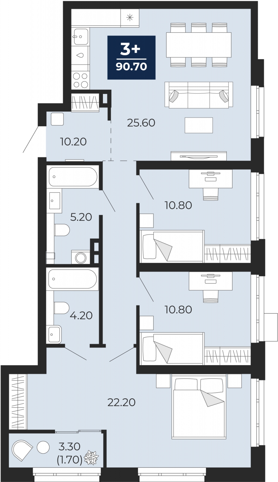 - Общая площадь 90.7 м²