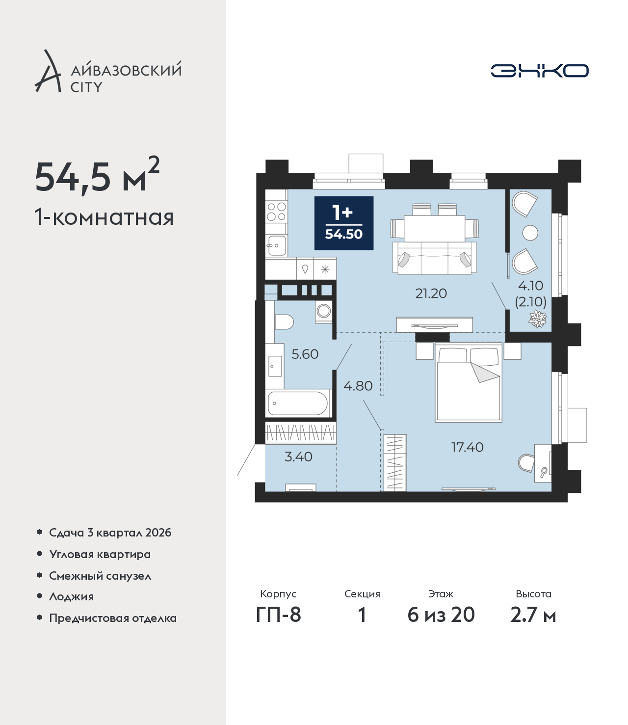 Продается 1-комн. квартира от застройщика с предчистовой отделкой в ЖК "Айвазовский City" на 6 этаже. Общая площадь: 54.5 кв.м., жилая: 17.4 кв.м., площадь просторной кухни-столовой: 21.2 кв.м. Угловая квартира, идеально подойдет любителям тишины и панорамных видов. В квартире одна лоджия, один совмещенный санузел. Высота потолков 2.7 м. Дом монолитный, многоподъездный, переменной этажности, от 14 до 24 этажей. Квартира находится в 1-й секции высотой 20 этажей в корпусе ГП-8. На этаже 6 квартир. В подъезде 1 пассажирский и 1 грузовой лифт. Окончание строительства - 3 квартал 2026 года. Оформление сделки по договору долевого участия. Новый жилой район располагается в живописном месте на берегу Туры в центральной части города. Принципиально новое пространство для жизни в центре современного города для тех, чьи мечты сбываются, кто нацелен на постоянный рост, перемены к лучшему для себя и своих близких. Каждая деталь Айвазовский City вдохновляет и заряжает на новые свершения: авторская архитектура, сбалансированная продуманная инфраструктура, дизайнерские дворы со спортивными и детскими площадками, парковые зоны с фонтанами, водный канал, украшающий центральный прогулочный маршрут района и многое другое. В 2019 года проект стал лауреатом престижной премии Urban Awards 2019 в номинации «Лучший строящийся региональный жилой комплекс бизнес-класса». Главная особенность Айвазовский City - соседство разных архитектурных школ в рамках одного дома. Изысканная классика, выразительная эклектика и оригинальный модерн - жить в одном из таких домов настоящий повод для гордости. Айвазовский City это идеальное сочетание комфорта, технологий и развитой инфраструктуры. Вход в подъезд возможен с улицы и со двора. Отправляясь на работу или за покупками, жители могут выйти с внешней стороны дома, а для прогулки с ребенком – со стороны двора. Экологически чистые материалы и энергосберегающие технологии, качественное освещение общественных зон, видеонаблюдение по всей территории жилого района (в том числе в подъездах, лифтах и в подземном паркинге), закрытые дворы с доступом только для жителей Айвазовский City. Часть домов в Айвазовский City будут оснащены подземным паркингом. Востребованный в нашем климатическом поясе формат хранения автомобилей защитит собственность владельца в любое время года. Аккредитация в банках: ПАО «Газпромбанк», ОАО «Альфа-Банк», ПАО Банк «ВТБ», «Сбербанк России», ПАО «Промсвязьбанк» и других. (AQID02487983)