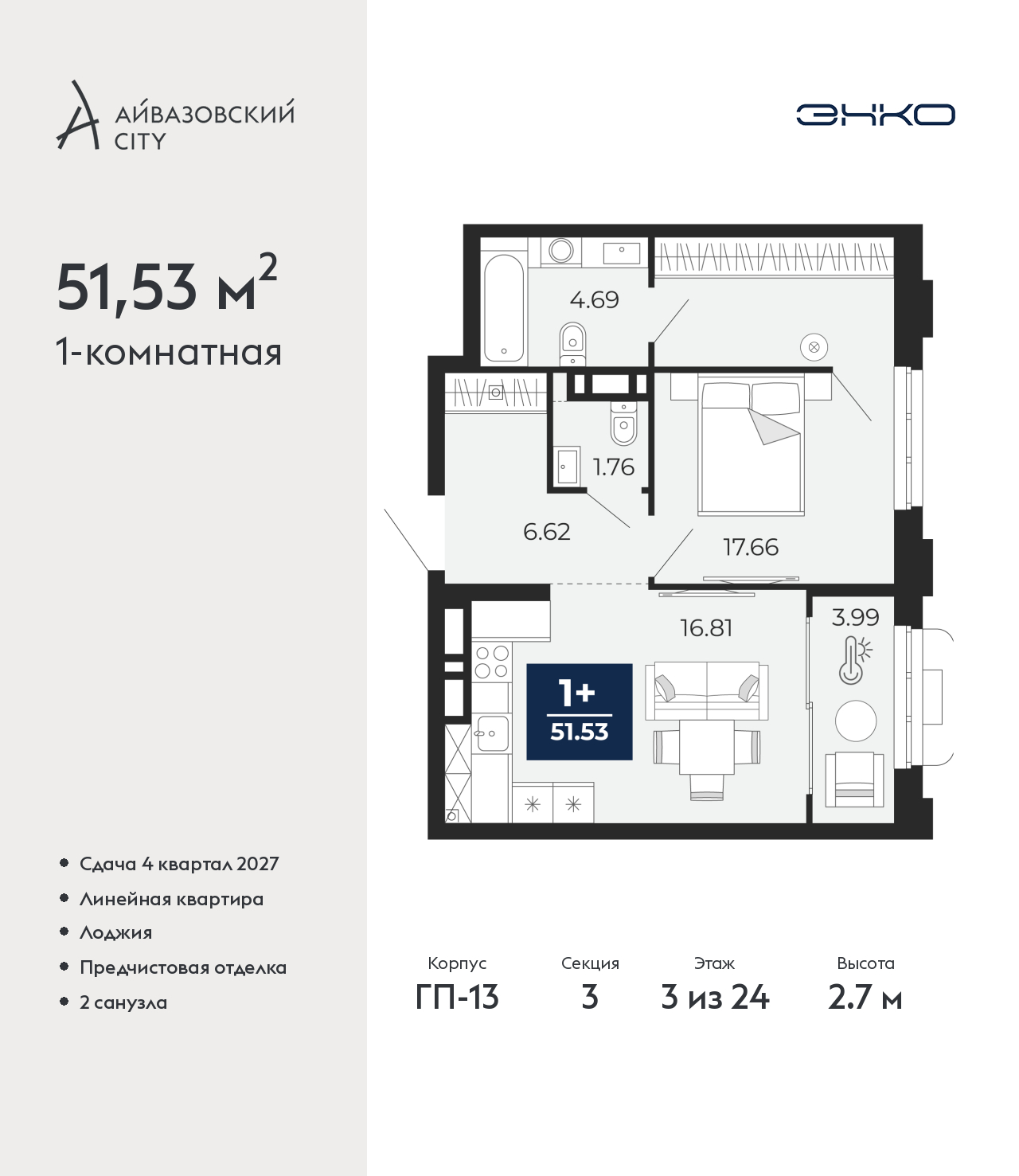 Однокомнатная квартира с предчистовой отделкой в ЖК "Айвазовский City" на 3 этаже. Общая площадь: 51.53 кв.м., жилая: 17.66 кв.м., площадь просторной кухни-столовой: 16.81 кв.м. Все окна выходят на одну сторону. В квартире одна лоджия, один совмещенный и один раздельный санузел. Высота потолков 2.7 м. Дом монолитный, многоподъездный, высотой 24 этажа. Квартира находится в 3-й секции в корпусе ГП-13. На этаже 9 квартир. В подъезде 1 пассажирский и 1 грузовой лифт. Окончание строительства - 4 квартал 2027 года. Оформление сделки по договору долевого участия. Новый жилой район располагается в живописном месте на берегу Туры в центральной части города. Принципиально новое пространство для жизни в центре современного города для тех, чьи мечты сбываются, кто нацелен на постоянный рост, перемены к лучшему для себя и своих близких. Каждая деталь Айвазовский City вдохновляет и заряжает на новые свершения: авторская архитектура, сбалансированная продуманная инфраструктура, дизайнерские дворы со спортивными и детскими площадками, парковые зоны с фонтанами, водный канал, украшающий центральный прогулочный маршрут района и многое другое. В 2019 года проект стал лауреатом престижной премии Urban Awards 2019 в номинации «Лучший строящийся региональный жилой комплекс бизнес-класса». Главная особенность Айвазовский City - соседство разных архитектурных школ в рамках одного дома. Изысканная классика, выразительная эклектика и оригинальный модерн - жить в одном из таких домов настоящий повод для гордости. Айвазовский City это идеальное сочетание комфорта, технологий и развитой инфраструктуры. Вход в подъезд возможен с улицы и со двора. Отправляясь на работу или за покупками, жители могут выйти с внешней стороны дома, а для прогулки с ребенком – со стороны двора. Экологически чистые материалы и энергосберегающие технологии, качественное освещение общественных зон, видеонаблюдение по всей территории жилого района (в том числе в подъездах, лифтах и в подземном паркинге), закрытые дворы с доступом только для жителей Айвазовский City. Часть домов в Айвазовский City будут оснащены подземным паркингом. Востребованный в нашем климатическом поясе формат хранения автомобилей защитит собственность владельца в любое время года. Аккредитация в банках: ПАО Банк «ВТБ», ПАО «Газпромбанк», ОАО «Альфа-Банк», «Сбербанк России», ПАО Банк «ФК Открытие» и других. (AQID02520708)