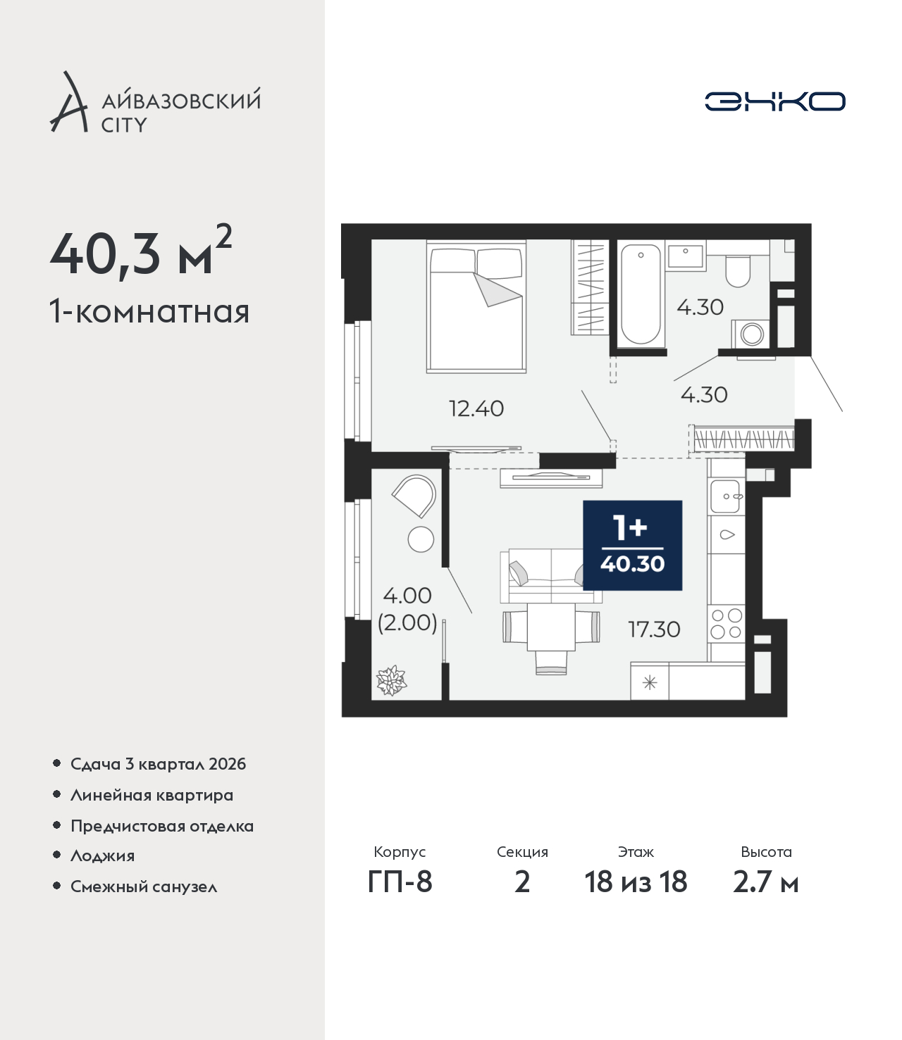 - Общая площадь 40.3 м²