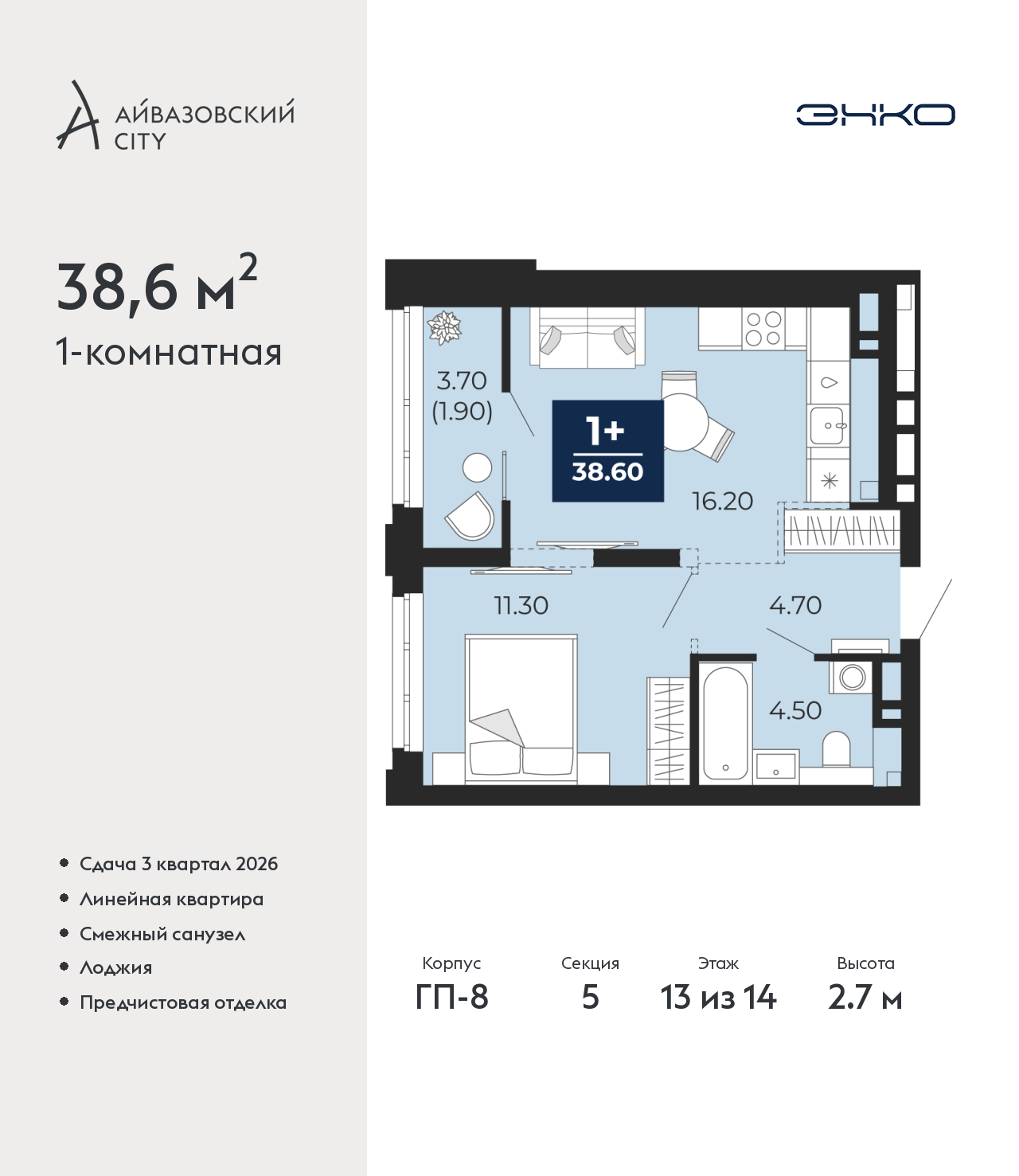 1-комн. квартира с предчистовой отделкой в ЖК "Айвазовский City" на 13 этаже. Общая площадь: 38.6 кв.м., жилая: 11.3 кв.м., площадь просторной кухни-столовой: 16.2 кв.м. Все окна выходят на одну сторону. В квартире одна лоджия, один совмещенный санузел. Высота потолков 2.7 м. Дом монолитный, многоподъездный, переменной этажности, от 14 до 24 этажей. Квартира находится в 5-й секции высотой 14 этажей в корпусе ГП-8. На этаже 5 квартир. В подъезде 1 пассажирский и 1 грузовой лифт. Окончание строительства - 3 квартал 2026 года. Оформление сделки по договору долевого участия. Новый жилой район располагается в живописном месте на берегу Туры в центральной части города. Принципиально новое пространство для жизни в центре современного города для тех, чьи мечты сбываются, кто нацелен на постоянный рост, перемены к лучшему для себя и своих близких. Каждая деталь Айвазовский City вдохновляет и заряжает на новые свершения: авторская архитектура, сбалансированная продуманная инфраструктура, дизайнерские дворы со спортивными и детскими площадками, парковые зоны с фонтанами, водный канал, украшающий центральный прогулочный маршрут района и многое другое. В 2019 года проект стал лауреатом престижной премии Urban Awards 2019 в номинации «Лучший строящийся региональный жилой комплекс бизнес-класса». Главная особенность Айвазовский City - соседство разных архитектурных школ в рамках одного дома. Изысканная классика, выразительная эклектика и оригинальный модерн - жить в одном из таких домов настоящий повод для гордости. Айвазовский City это идеальное сочетание комфорта, технологий и развитой инфраструктуры. Вход в подъезд возможен с улицы и со двора. Отправляясь на работу или за покупками, жители могут выйти с внешней стороны дома, а для прогулки с ребенком – со стороны двора. Экологически чистые материалы и энергосберегающие технологии, качественное освещение общественных зон, видеонаблюдение по всей территории жилого района (в том числе в подъездах, лифтах и в подземном паркинге), закрытые дворы с доступом только для жителей Айвазовский City. Часть домов в Айвазовский City будут оснащены подземным паркингом. Востребованный в нашем климатическом поясе формат хранения автомобилей защитит собственность владельца в любое время года. Аккредитация в банках: ОАО «Альфа-Банк», ПАО «Газпромбанк», «Сбербанк России», ПАО Банк «ВТБ», ПАО «Промсвязьбанк» и других. (AQID02488040)