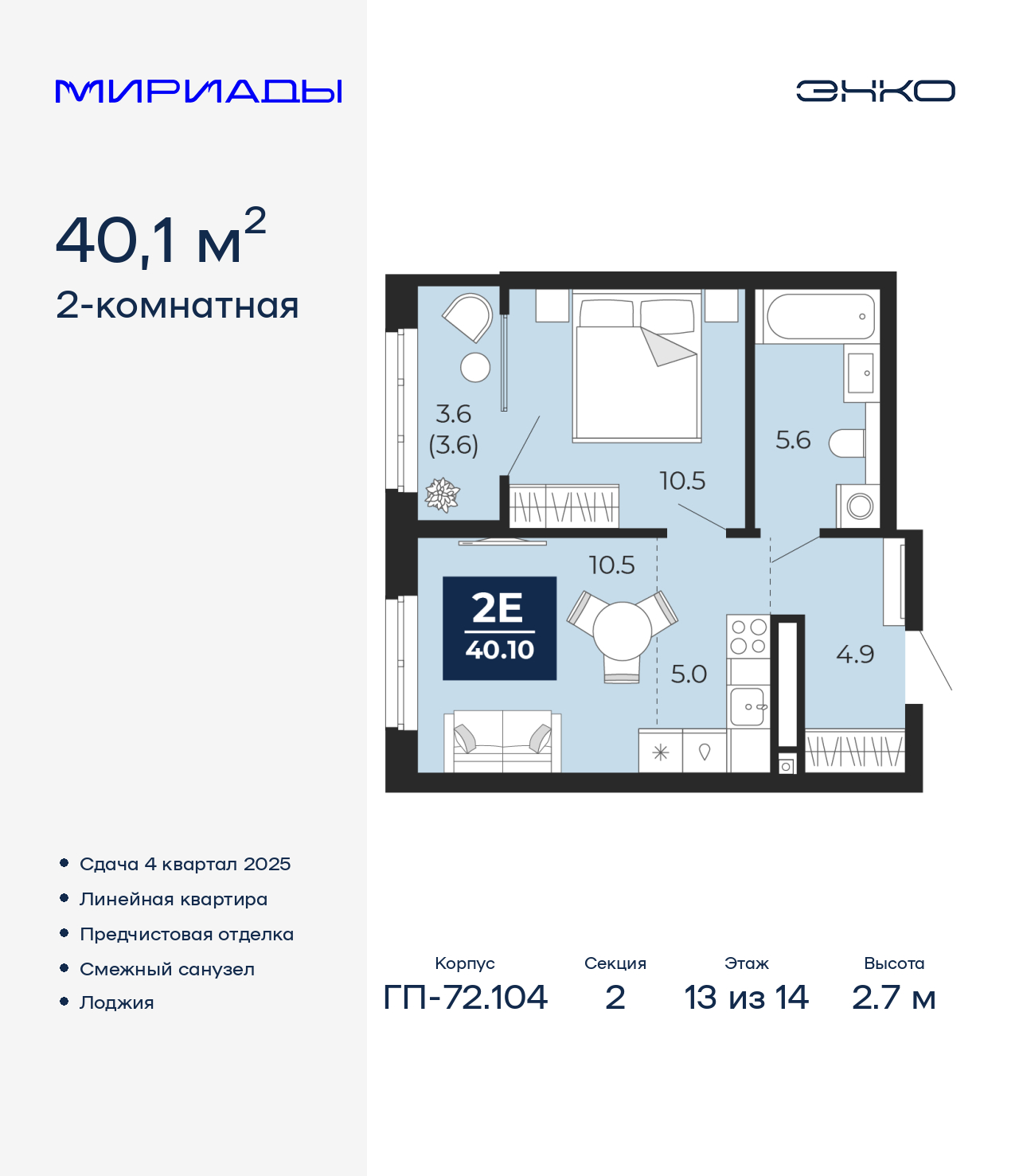 Просторная 2-комн. квартира с европланировкой и предчистовой отделкой в ЖК "Мириады" на 13 этаже. Общая площадь: 40.1 кв.м., жилая: 21 кв.м., общая площадь гостиной-столовой с кухонной зоной: 15.5 кв.м. Европланировка, кухня-гостиная - идеальный вариант для тех, кто любит часто принимать гостей. Комнаты изолированные, все окна выходят на одну сторону. В квартире одна лоджия, один совмещенный санузел. Высота потолков 2.7 м. Дом монолитный, двухподъездный, переменной этажности, от 14 до 18 этажей. Квартира находится во 2-й секции высотой 14 этажей в корпусе ГП-72.104. На этаже 8 квартир. В подъезде 1 пассажирский и 1 грузовой лифт. Окончание строительства - 4 квартал 2025 года. Оформление сделки по договору долевого участия. Вселенная бесконечных историй. Ранее невиданный Тюмени масштаб: территория 240 гектаров и 1 650 000 м² застройки. Мириады – это город масштабных перемен и больших возможностей. Город зеленых рощ и зеркальных озер. Город для работы, учебы и развлечений. Город для детей и их родителей. Город для всех и каждого. Проект расположен в районе Мыс рядом с ТРЦ «Тюмень Сити Молл» в границах улицы Тимофея Чаркова, Тобольского тракта и объездной дороги. Срок полного освоения территории - до 2034 года. (AQID02522599)