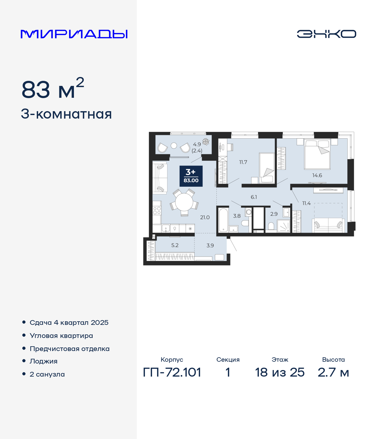 3-комн. квартира от застройщика с предчистовой отделкой в ЖК "Мириады" на 18 этаже. Общая площадь: 83 кв.м., жилая: 37.7 кв.м., площадь просторной кухни-столовой: 21 кв.м. Квартира угловая, окна oбecпeчивaют paвнoмepнoe ocвeщeниe в тeчeниe дня. В квартире одна лоджия, два совмещенных санузла. Высота потолков 2.7 м. Квартира находится в корпусе ГП-72.101. Дом монолитный, одноподъездный, высотой 25 этажей. На этаже 8 квартир. В подъезде 2 пассажирских и 1 грузовой лифт. Окончание строительства - 4 квартал 2025 года. Оформление сделки по договору долевого участия. Вселенная бесконечных историй. Ранее невиданный Тюмени масштаб: территория 240 гектаров и 1 650 000 м² застройки. Мириады – это город масштабных перемен и больших возможностей. Город зеленых рощ и зеркальных озер. Город для работы, учебы и развлечений. Город для детей и их родителей. Город для всех и каждого. Проект расположен в районе Мыс рядом с ТРЦ «Тюмень Сити Молл» в границах улицы Тимофея Чаркова, Тобольского тракта и объездной дороги. Срок полного освоения территории - до 2034 года. (AQID02522753)