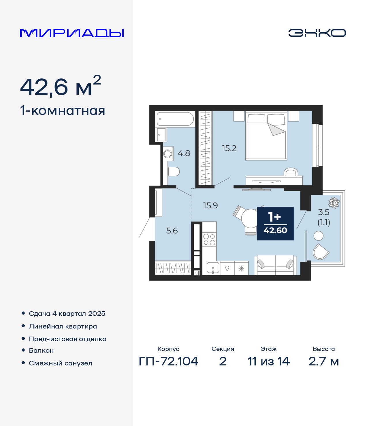 Однокомнатная квартира от застройщика с предчистовой отделкой в ЖК "Мириады" на 11 этаже. Общая площадь: 42.6 кв.м., жилая: 15.2 кв.м., площадь просторной кухни-столовой: 15.9 кв.м. Все окна выходят на одну сторону. В квартире один балкон, один совмещенный санузел. Высота потолков 2.7 м. Дом монолитный, двухподъездный, переменной этажности, от 14 до 18 этажей. Квартира находится во 2-й секции высотой 14 этажей в корпусе ГП-72.104. На этаже 8 квартир. В подъезде 1 пассажирский и 1 грузовой лифт. Окончание строительства - 4 квартал 2025 года. Оформление сделки по договору долевого участия. Вселенная бесконечных историй. Ранее невиданный Тюмени масштаб: территория 240 гектаров и 1 650 000 м² застройки. Мириады – это город масштабных перемен и больших возможностей. Город зеленых рощ и зеркальных озер. Город для работы, учебы и развлечений. Город для детей и их родителей. Город для всех и каждого. Проект расположен в районе Мыс рядом с ТРЦ «Тюмень Сити Молл» в границах улицы Тимофея Чаркова, Тобольского тракта и объездной дороги. Срок полного освоения территории - до 2034 года. (AQID02522774)