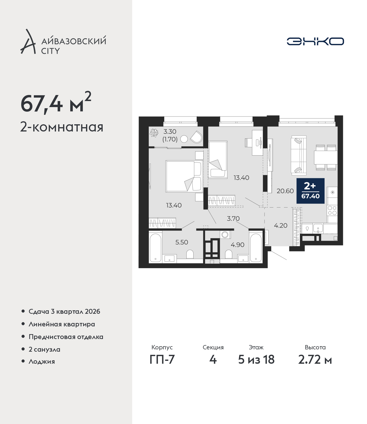 - Общая площадь 67.4 м²