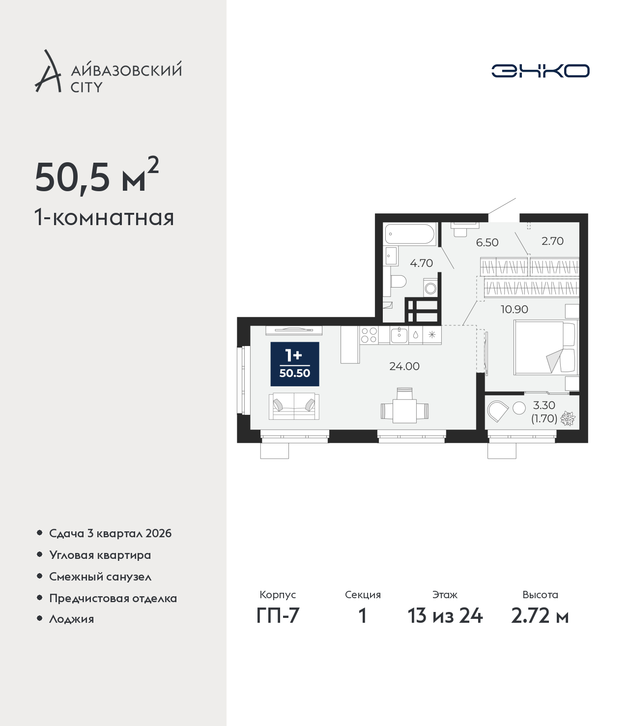 Продается однокомнатная квартира с предчистовой отделкой в ЖК "Айвазовский City" на 13 этаже. Общая площадь: 50.5 кв.м., жилая: 10.9 кв.м., площадь просторной кухни-столовой: 24 кв.м. Квартира угловая, окна oбecпeчивaют paвнoмepнoe ocвeщeниe в тeчeниe дня. В квартире одна лоджия, один совмещенный санузел. Высота потолков 2.72 м. Дом монолитный, многоподъездный, переменной этажности, от 9 до 24 этажей. Квартира находится в 1-й секции высотой 24 этажа в корпусе ГП-7. На этаже 6 квартир. В подъезде 1 пассажирский и 2 грузовых лифта. Окончание строительства - 3 квартал 2026 года. Оформление сделки по договору долевого участия. Новый жилой район располагается в живописном месте на берегу Туры в центральной части города. Принципиально новое пространство для жизни в центре современного города для тех, чьи мечты сбываются, кто нацелен на постоянный рост, перемены к лучшему для себя и своих близких. Каждая деталь Айвазовский City вдохновляет и заряжает на новые свершения: авторская архитектура, сбалансированная продуманная инфраструктура, дизайнерские дворы со спортивными и детскими площадками, парковые зоны с фонтанами, водный канал, украшающий центральный прогулочный маршрут района и многое другое. В 2019 года проект стал лауреатом престижной премии Urban Awards 2019 в номинации «Лучший строящийся региональный жилой комплекс бизнес-класса». Главная особенность Айвазовский City - соседство разных архитектурных школ в рамках одного дома. Изысканная классика, выразительная эклектика и оригинальный модерн - жить в одном из таких домов настоящий повод для гордости. Айвазовский City это идеальное сочетание комфорта, технологий и развитой инфраструктуры. Вход в подъезд возможен с улицы и со двора. Отправляясь на работу или за покупками, жители могут выйти с внешней стороны дома, а для прогулки с ребенком – со стороны двора. Экологически чистые материалы и энергосберегающие технологии, качественное освещение общественных зон, видеонаблюдение по всей территории жилого района (в том числе в подъездах, лифтах и в подземном паркинге), закрытые дворы с доступом только для жителей Айвазовский City. Часть домов в Айвазовский City будут оснащены подземным паркингом. Востребованный в нашем климатическом поясе формат хранения автомобилей защитит собственность владельца в любое время года. Аккредитация в банках: ОАО «Альфа-Банк», ПАО «Газпромбанк», «Сбербанк России», ПАО Банк «ВТБ», ПАО Банк «ФК Открытие» и других. (AQID02487901)
