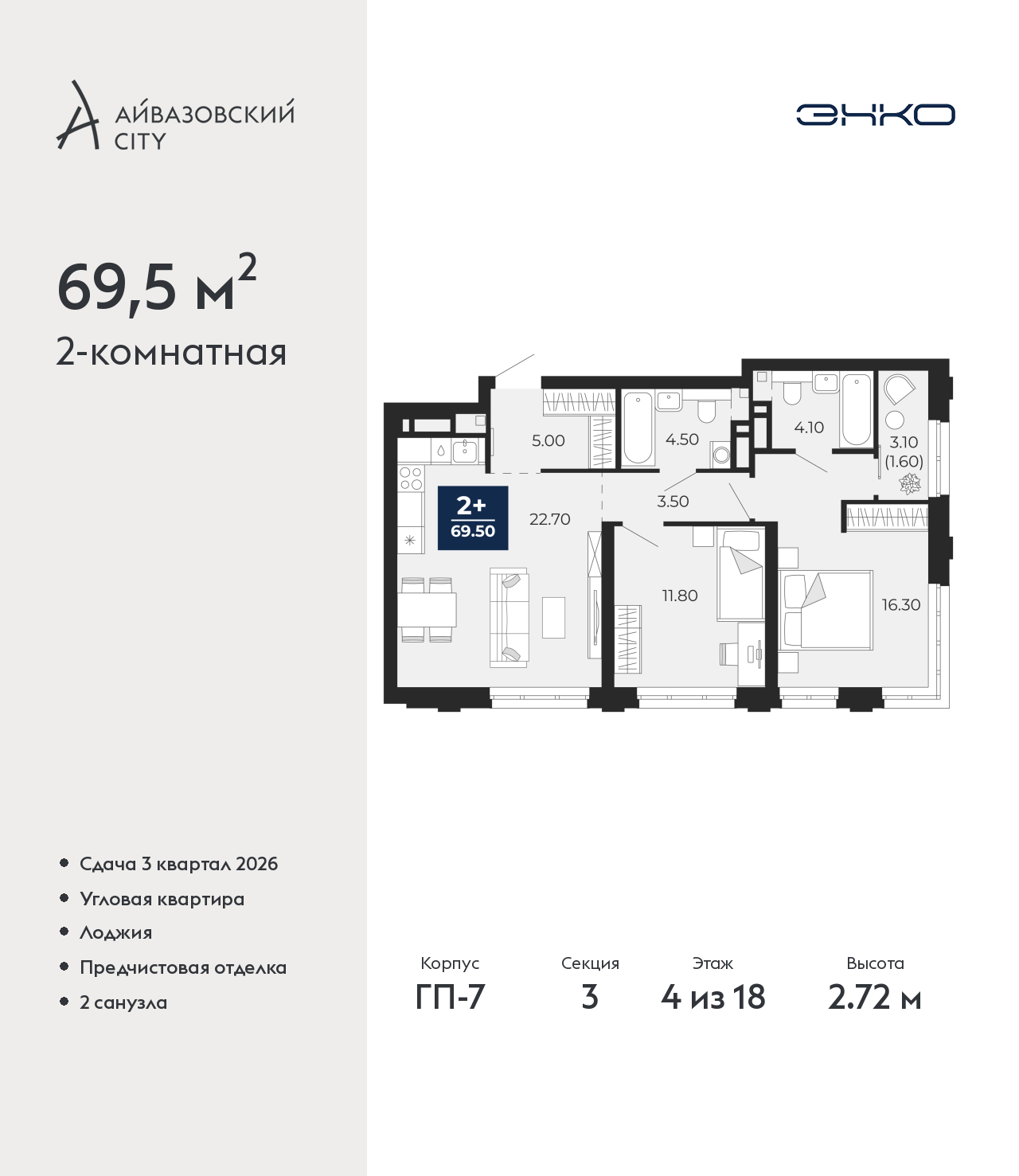 - Общая площадь 69.5 м²