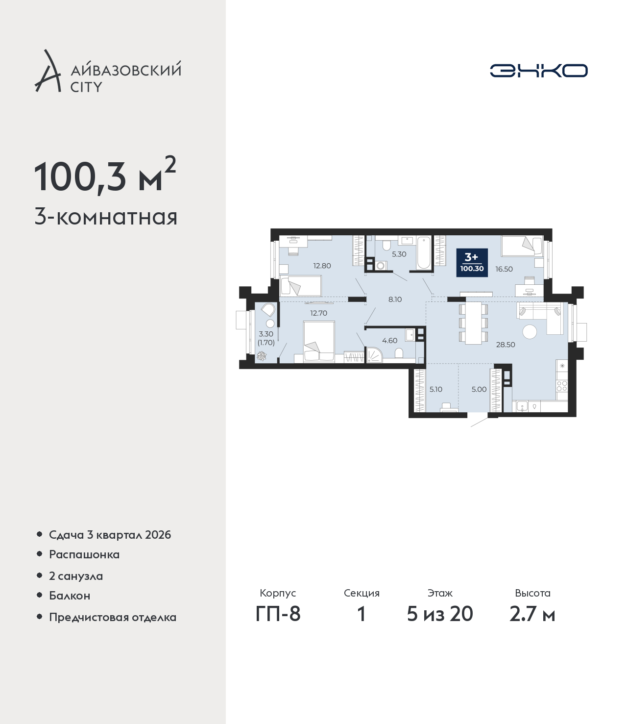 Просторная 3-комн. квартира с предчистовой отделкой в ЖК "Айвазовский City" на 5 этаже. Общая площадь: 100.3 кв.м., жилая: 42 кв.м., площадь просторной кухни-столовой: 28.5 кв.м. Квартира - распашонка, без проходных комнат, окна выходят на paзные стороны дома. В квартире один балкон, два совмещенных санузла. Высота потолков 2.7 м. Дом монолитный, многоподъездный, переменной этажности, от 14 до 24 этажей. Квартира находится в 1-й секции высотой 20 этажей в корпусе ГП-8. На этаже 6 квартир. В подъезде 1 пассажирский и 1 грузовой лифт. Окончание строительства - 3 квартал 2026 года. Оформление сделки по договору долевого участия. Новый жилой район располагается в живописном месте на берегу Туры в центральной части города. Принципиально новое пространство для жизни в центре современного города для тех, чьи мечты сбываются, кто нацелен на постоянный рост, перемены к лучшему для себя и своих близких. Каждая деталь Айвазовский City вдохновляет и заряжает на новые свершения: авторская архитектура, сбалансированная продуманная инфраструктура, дизайнерские дворы со спортивными и детскими площадками, парковые зоны с фонтанами, водный канал, украшающий центральный прогулочный маршрут района и многое другое. В 2019 года проект стал лауреатом престижной премии Urban Awards 2019 в номинации «Лучший строящийся региональный жилой комплекс бизнес-класса». Главная особенность Айвазовский City - соседство разных архитектурных школ в рамках одного дома. Изысканная классика, выразительная эклектика и оригинальный модерн - жить в одном из таких домов настоящий повод для гордости. Айвазовский City это идеальное сочетание комфорта, технологий и развитой инфраструктуры. Вход в подъезд возможен с улицы и со двора. Отправляясь на работу или за покупками, жители могут выйти с внешней стороны дома, а для прогулки с ребенком – со стороны двора. Экологически чистые материалы и энергосберегающие технологии, качественное освещение общественных зон, видеонаблюдение по всей территории жилого района (в том числе в подъездах, лифтах и в подземном паркинге), закрытые дворы с доступом только для жителей Айвазовский City. Часть домов в Айвазовский City будут оснащены подземным паркингом. Востребованный в нашем климатическом поясе формат хранения автомобилей защитит собственность владельца в любое время года. Аккредитация в банках: «Сбербанк России», ОАО «Альфа-Банк», ПАО Банк «ВТБ», ПАО «Газпромбанк», ПАО Банк «ФК Открытие» и других. (AQID02487985)