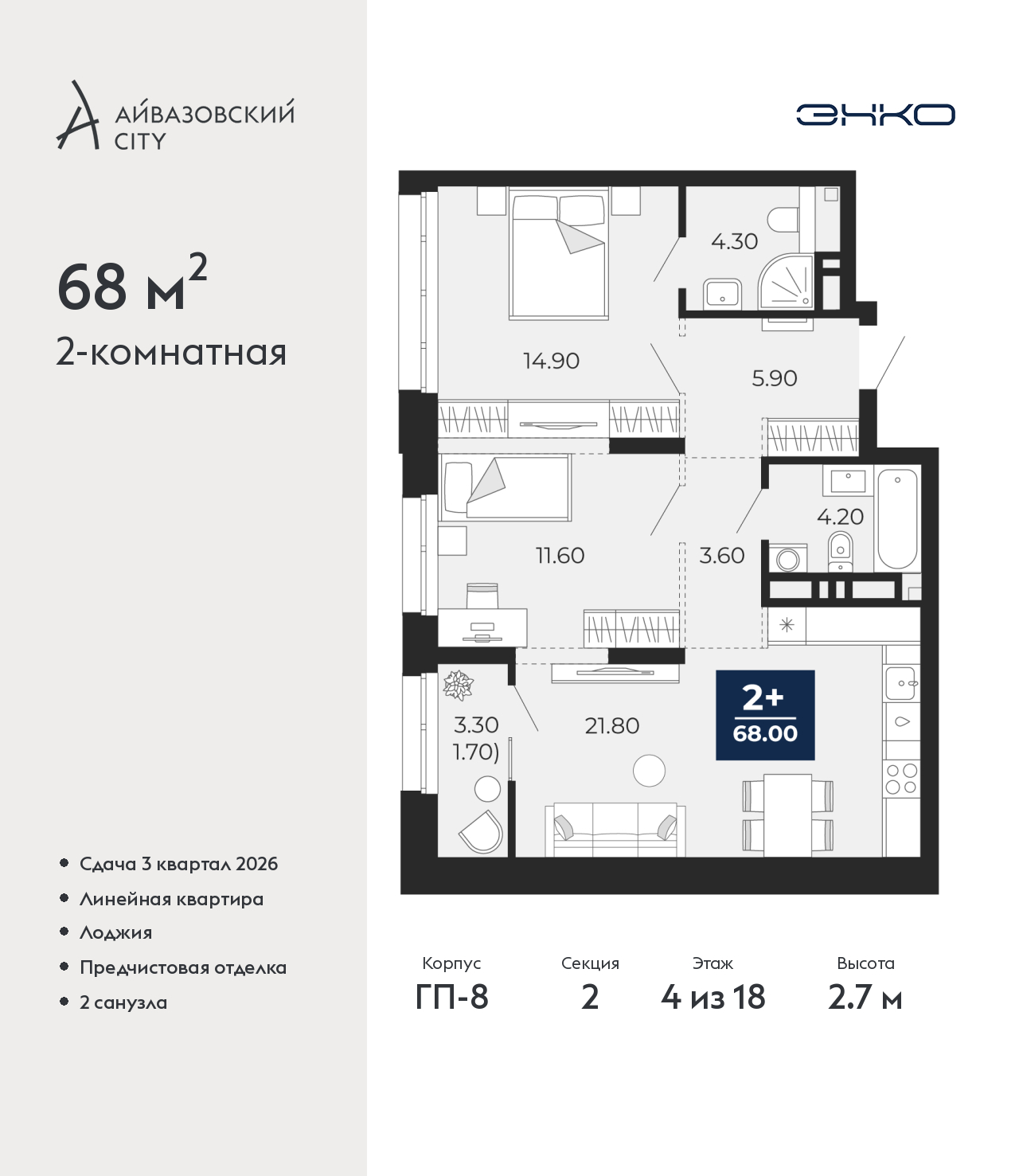 - Общая площадь 68 м²