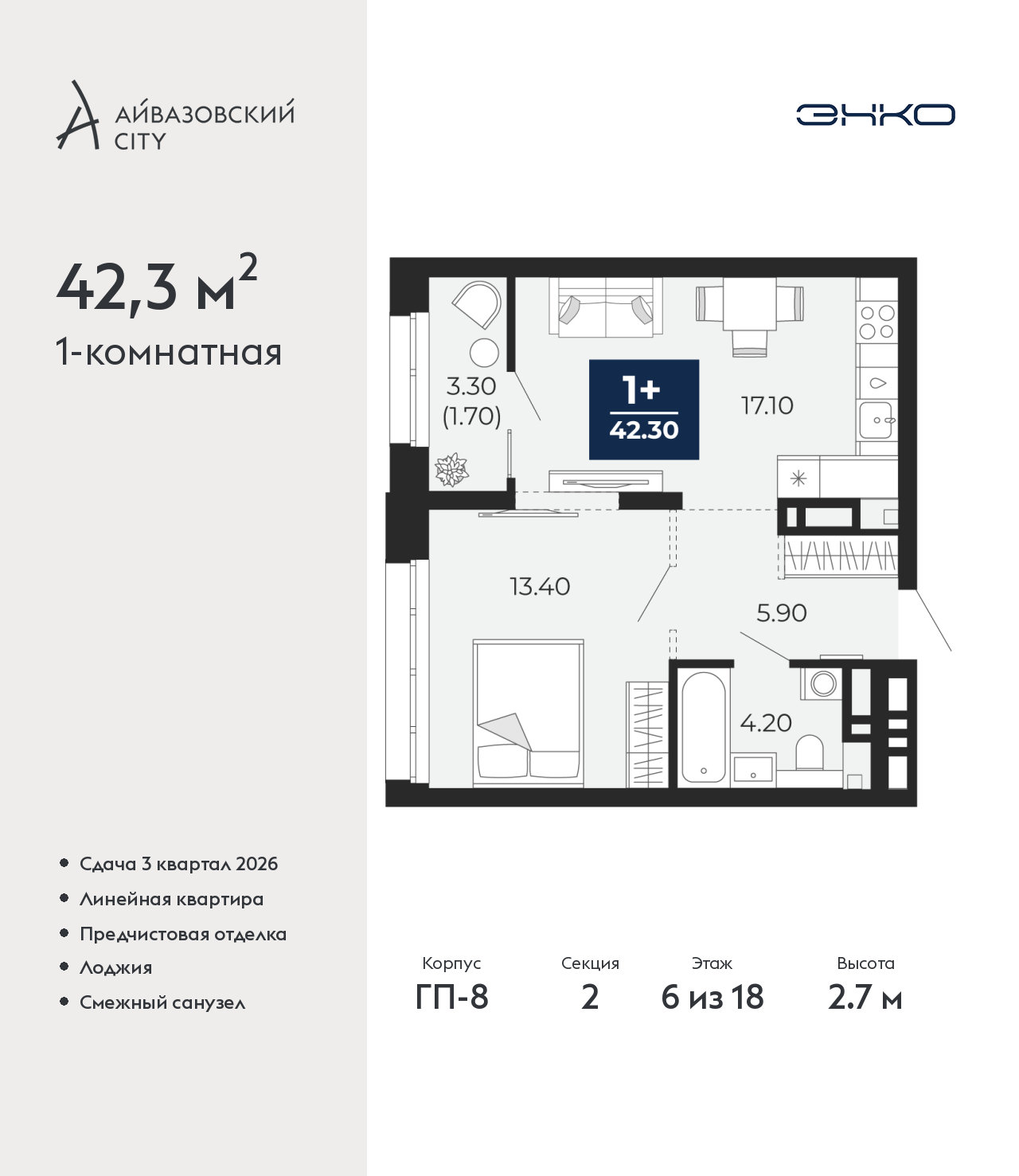 - Общая площадь 42.3 м²