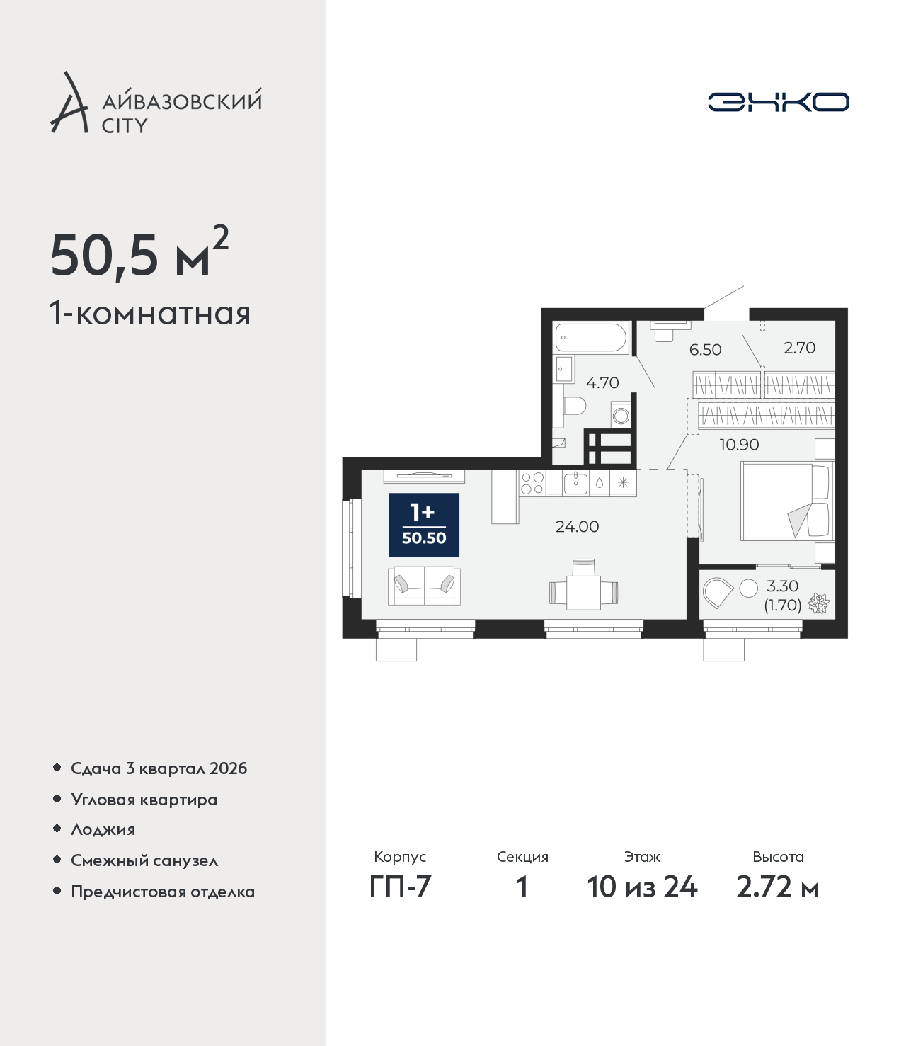 Продается однокомнатная квартира с предчистовой отделкой в ЖК "Айвазовский City" на 10 этаже. Общая площадь: 50.5 кв.м., жилая: 10.9 кв.м., площадь просторной кухни-столовой: 24 кв.м. Квартира угловая, очень светлая, естественная вентиляция при открытии окон. В квартире одна лоджия, один совмещенный санузел. Высота потолков 2.72 м. Дом монолитный, многоподъездный, переменной этажности, от 9 до 24 этажей. Квартира находится в 1-й секции высотой 24 этажа в корпусе ГП-7. На этаже 6 квартир. В подъезде 1 пассажирский и 2 грузовых лифта. Окончание строительства - 3 квартал 2026 года. Оформление сделки по договору долевого участия. Новый жилой район располагается в живописном месте на берегу Туры в центральной части города. Принципиально новое пространство для жизни в центре современного города для тех, чьи мечты сбываются, кто нацелен на постоянный рост, перемены к лучшему для себя и своих близких. Каждая деталь Айвазовский City вдохновляет и заряжает на новые свершения: авторская архитектура, сбалансированная продуманная инфраструктура, дизайнерские дворы со спортивными и детскими площадками, парковые зоны с фонтанами, водный канал, украшающий центральный прогулочный маршрут района и многое другое. В 2019 года проект стал лауреатом престижной премии Urban Awards 2019 в номинации «Лучший строящийся региональный жилой комплекс бизнес-класса». Главная особенность Айвазовский City - соседство разных архитектурных школ в рамках одного дома. Изысканная классика, выразительная эклектика и оригинальный модерн - жить в одном из таких домов настоящий повод для гордости. Айвазовский City это идеальное сочетание комфорта, технологий и развитой инфраструктуры. Вход в подъезд возможен с улицы и со двора. Отправляясь на работу или за покупками, жители могут выйти с внешней стороны дома, а для прогулки с ребенком – со стороны двора. Экологически чистые материалы и энергосберегающие технологии, качественное освещение общественных зон, видеонаблюдение по всей территории жилого района (в том числе в подъездах, лифтах и в подземном паркинге), закрытые дворы с доступом только для жителей Айвазовский City. Часть домов в Айвазовский City будут оснащены подземным паркингом. Востребованный в нашем климатическом поясе формат хранения автомобилей защитит собственность владельца в любое время года. Аккредитация в банках: «Сбербанк России», ПАО «Газпромбанк», ОАО «Альфа-Банк», ПАО Банк «ВТБ», ПАО «Совкомбанк» и других. (AQID02497743)