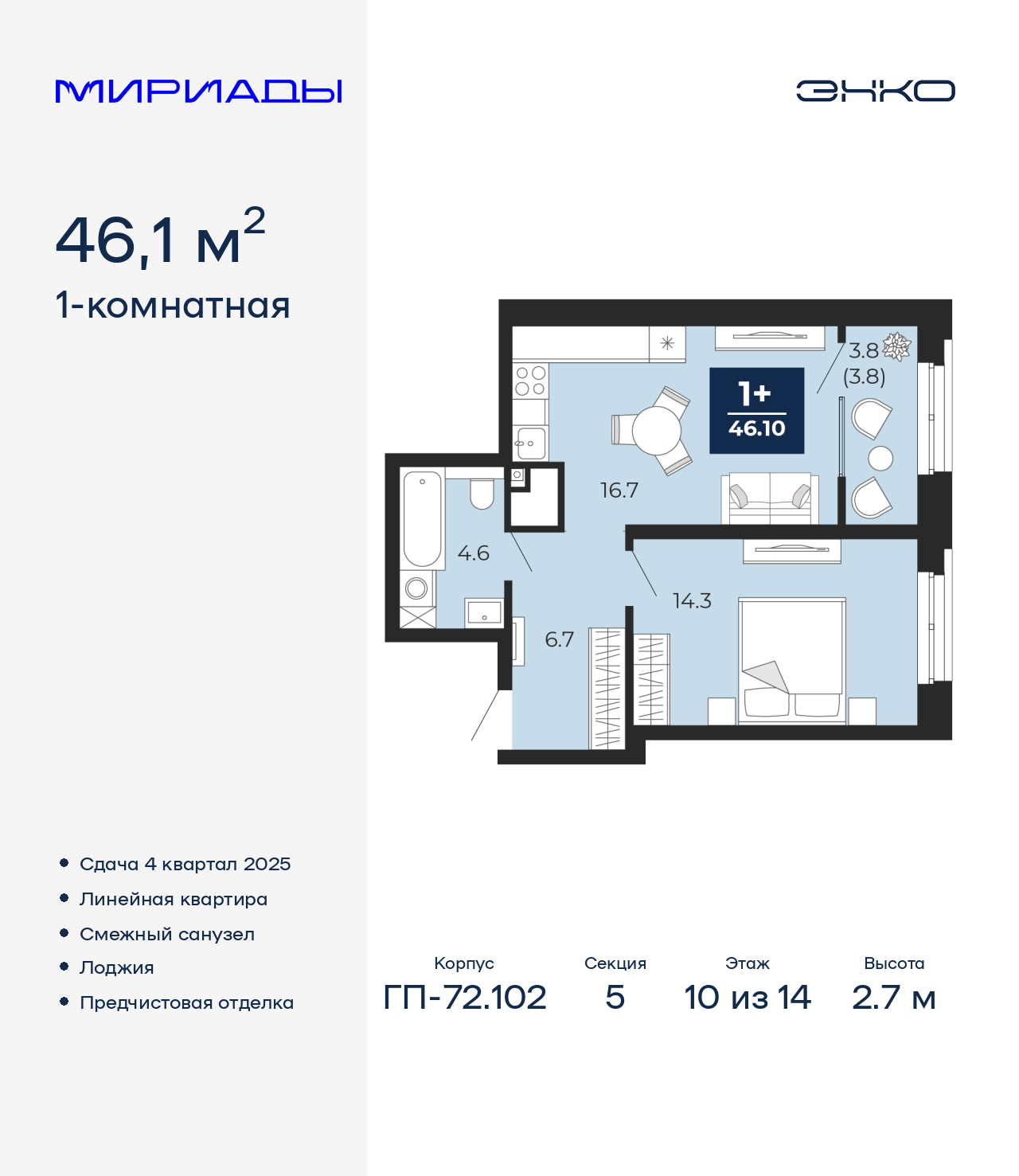 1-комн. квартира от застройщика с предчистовой отделкой в ЖК "Мириады" на 10 этаже. Общая площадь: 46.1 кв.м., жилая: 14.3 кв.м., площадь просторной кухни-столовой: 16.7 кв.м. Все окна выходят на одну сторону. В квартире одна лоджия, один совмещенный санузел. Высота потолков 2.7 м. Дом монолитный, многоподъездный, переменной этажности, от 14 до 16 этажей. Квартира находится в 5-й секции высотой 14 этажей в корпусе ГП-72.102. На этаже 8 квартир. В подъезде 1 пассажирский и 1 грузовой лифт. Окончание строительства - 1 квартал 2026 года. Оформление сделки по договору долевого участия. Вселенная бесконечных историй. Ранее невиданный Тюмени масштаб: территория 240 гектаров и 1 650 000 м² застройки. Мириады – это город масштабных перемен и больших возможностей. Город зеленых рощ и зеркальных озер. Город для работы, учебы и развлечений. Город для детей и их родителей. Город для всех и каждого. Проект расположен в районе Мыс рядом с ТРЦ «Тюмень Сити Молл» в границах улицы Тимофея Чаркова, Тобольского тракта и объездной дороги. Срок полного освоения территории - до 2034 года. (AQID02536540)