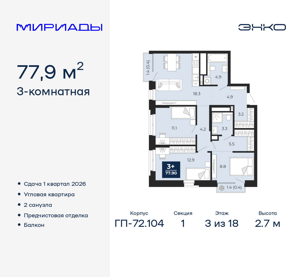 - Общая площадь 77.9 м²