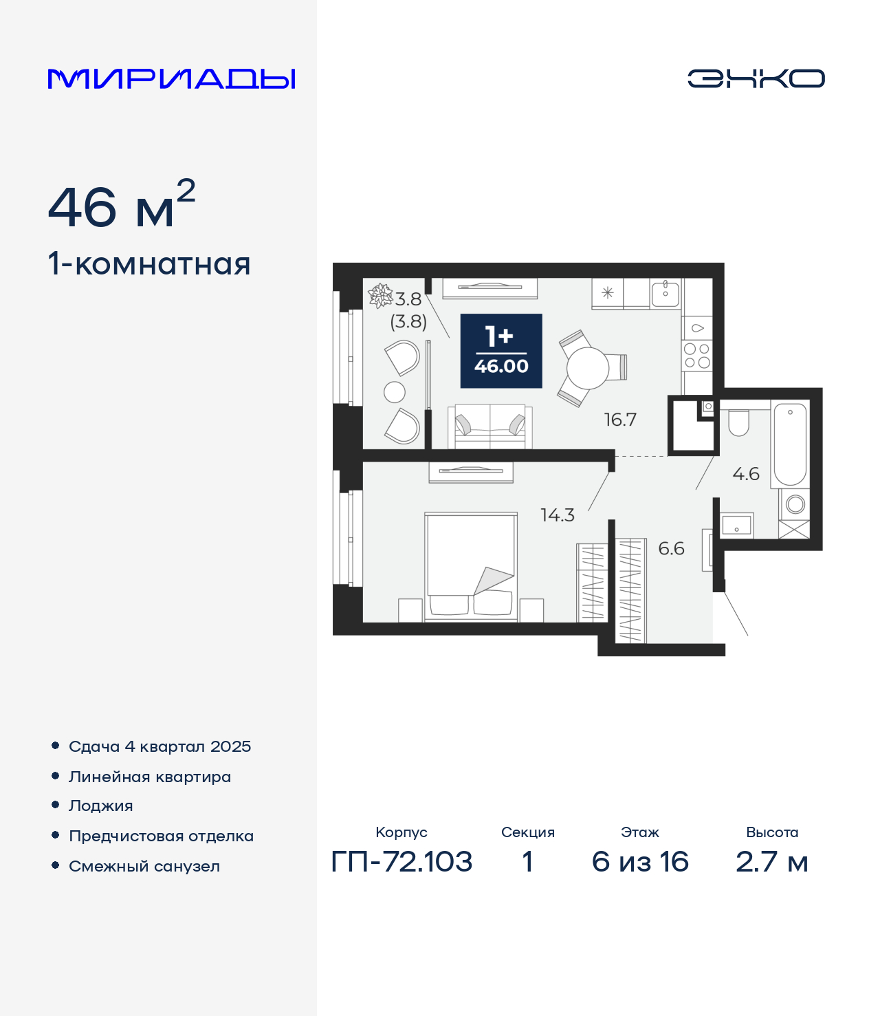 1-комн. квартира с предчистовой отделкой в ЖК "Мириады" на 6 этаже. Общая площадь: 46 кв.м., жилая: 14.3 кв.м., площадь просторной кухни-столовой: 16.7 кв.м. Все окна выходят на одну сторону. В квартире одна лоджия, один совмещенный санузел. Высота потолков 2.7 м. Дом монолитный, трехподъездный, переменной этажности, от 14 до 16 этажей. Квартира находится в 1-й секции высотой 16 этажей в корпусе ГП-72.103. На этаже 8 квартир. В подъезде 1 пассажирский и 1 грузовой лифт. Окончание строительства - 1 квартал 2026 года. Оформление сделки по договору долевого участия. Вселенная бесконечных историй. Ранее невиданный Тюмени масштаб: территория 240 гектаров и 1 650 000 м² застройки. Мириады – это город масштабных перемен и больших возможностей. Город зеленых рощ и зеркальных озер. Город для работы, учебы и развлечений. Город для детей и их родителей. Город для всех и каждого. Проект расположен в районе Мыс рядом с ТРЦ «Тюмень Сити Молл» в границах улицы Тимофея Чаркова, Тобольского тракта и объездной дороги. Срок полного освоения территории - до 2034 года. (AQID02536603)