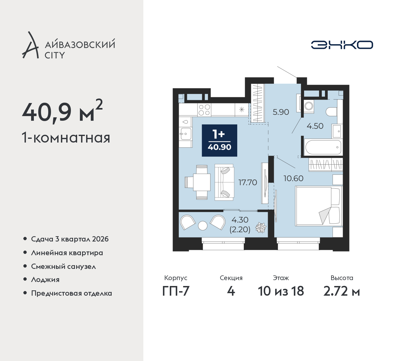 Продается однокомнатная квартира от застройщика с предчистовой отделкой в ЖК "Айвазовский City" на 10 этаже. Общая площадь: 40.9 кв.м., жилая: 10.6 кв.м., площадь просторной кухни-столовой: 17.7 кв.м. Все окна выходят на одну сторону. В квартире одна лоджия, один совмещенный санузел. Высота потолков 2.72 м. Дом монолитный, многоподъездный, переменной этажности, от 9 до 24 этажей. Квартира находится в 4-й секции высотой 18 этажей в корпусе ГП-7. На этаже 5 квартир. В подъезде 1 пассажирский и 2 грузовых лифта. Окончание строительства - 3 квартал 2026 года. Оформление сделки по договору долевого участия. Новый жилой район располагается в живописном месте на берегу Туры в центральной части города. Принципиально новое пространство для жизни в центре современного города для тех, чьи мечты сбываются, кто нацелен на постоянный рост, перемены к лучшему для себя и своих близких. Каждая деталь Айвазовский City вдохновляет и заряжает на новые свершения: авторская архитектура, сбалансированная продуманная инфраструктура, дизайнерские дворы со спортивными и детскими площадками, парковые зоны с фонтанами, водный канал, украшающий центральный прогулочный маршрут района и многое другое. В 2019 года проект стал лауреатом престижной премии Urban Awards 2019 в номинации «Лучший строящийся региональный жилой комплекс бизнес-класса». Главная особенность Айвазовский City - соседство разных архитектурных школ в рамках одного дома. Изысканная классика, выразительная эклектика и оригинальный модерн - жить в одном из таких домов настоящий повод для гордости. Айвазовский City это идеальное сочетание комфорта, технологий и развитой инфраструктуры. Вход в подъезд возможен с улицы и со двора. Отправляясь на работу или за покупками, жители могут выйти с внешней стороны дома, а для прогулки с ребенком – со стороны двора. Экологически чистые материалы и энергосберегающие технологии, качественное освещение общественных зон, видеонаблюдение по всей территории жилого района (в том числе в подъездах, лифтах и в подземном паркинге), закрытые дворы с доступом только для жителей Айвазовский City. Часть домов в Айвазовский City будут оснащены подземным паркингом. Востребованный в нашем климатическом поясе формат хранения автомобилей защитит собственность владельца в любое время года. Аккредитация в банках: ОАО «Альфа-Банк», ПАО Банк «ВТБ», ПАО «Газпромбанк», «Сбербанк России», ПАО «Промсвязьбанк» и других. (AQID02343145)