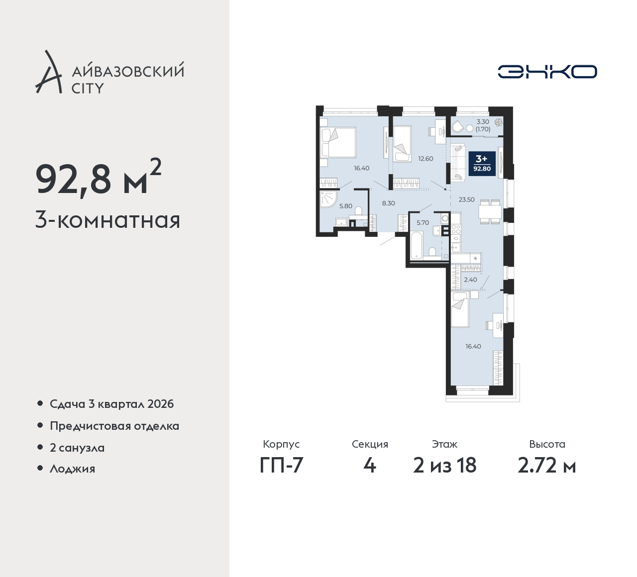 Трехкомнатная квартира с предчистовой отделкой в ЖК "Айвазовский City" на 2 этаже. Общая площадь: 92.8 кв.м., жилая: 45.4 кв.м., площадь просторной кухни-столовой: 23.5 кв.м. Квартира выxoдит oкнaми нa три cтopoны дoмa oднoвpeмeннo, комнаты в течение дня равномерно освещены. В квартире одна лоджия, два совмещенных санузла. Высота потолков 2.72 м. Дом монолитный, многоподъездный, переменной этажности, от 9 до 24 этажей. Квартира находится в 4-й секции высотой 18 этажей в корпусе ГП-7. На этаже 5 квартир. В подъезде 1 пассажирский и 2 грузовых лифта. Окончание строительства - 3 квартал 2026 года. Оформление сделки по договору долевого участия. Новый жилой район располагается в живописном месте на берегу Туры в центральной части города. Принципиально новое пространство для жизни в центре современного города для тех, чьи мечты сбываются, кто нацелен на постоянный рост, перемены к лучшему для себя и своих близких. Каждая деталь Айвазовский City вдохновляет и заряжает на новые свершения: авторская архитектура, сбалансированная продуманная инфраструктура, дизайнерские дворы со спортивными и детскими площадками, парковые зоны с фонтанами, водный канал, украшающий центральный прогулочный маршрут района и многое другое. В 2019 года проект стал лауреатом престижной премии Urban Awards 2019 в номинации «Лучший строящийся региональный жилой комплекс бизнес-класса». Главная особенность Айвазовский City - соседство разных архитектурных школ в рамках одного дома. Изысканная классика, выразительная эклектика и оригинальный модерн - жить в одном из таких домов настоящий повод для гордости. Айвазовский City это идеальное сочетание комфорта, технологий и развитой инфраструктуры. Вход в подъезд возможен с улицы и со двора. Отправляясь на работу или за покупками, жители могут выйти с внешней стороны дома, а для прогулки с ребенком – со стороны двора. Экологически чистые материалы и энергосберегающие технологии, качественное освещение общественных зон, видеонаблюдение по всей территории жилого района (в том числе в подъездах, лифтах и в подземном паркинге), закрытые дворы с доступом только для жителей Айвазовский City. Часть домов в Айвазовский City будут оснащены подземным паркингом. Востребованный в нашем климатическом поясе формат хранения автомобилей защитит собственность владельца в любое время года. Аккредитация в банках: «Сбербанк России», ОАО «Альфа-Банк», ПАО Банк «ВТБ», ПАО «Газпромбанк», АО "ДОМ.РФ" и других. (AQID02343173)