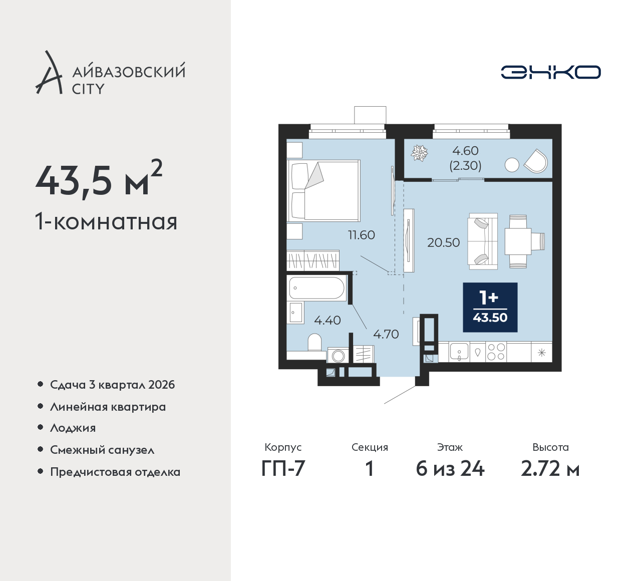 1-комн. квартира с предчистовой отделкой в ЖК "Айвазовский City" на 6 этаже. Общая площадь: 43.5 кв.м., жилая: 11.6 кв.м., площадь просторной кухни-столовой: 20.5 кв.м. Все окна выходят на одну сторону. В квартире одна лоджия, один совмещенный санузел. Высота потолков 2.72 м. Дом монолитный, многоподъездный, переменной этажности, от 9 до 24 этажей. Квартира находится в 1-й секции высотой 24 этажа в корпусе ГП-7. На этаже 6 квартир. В подъезде 1 пассажирский и 2 грузовых лифта. Окончание строительства - 3 квартал 2026 года. Оформление сделки по договору долевого участия. Новый жилой район располагается в живописном месте на берегу Туры в центральной части города. Принципиально новое пространство для жизни в центре современного города для тех, чьи мечты сбываются, кто нацелен на постоянный рост, перемены к лучшему для себя и своих близких. Каждая деталь Айвазовский City вдохновляет и заряжает на новые свершения: авторская архитектура, сбалансированная продуманная инфраструктура, дизайнерские дворы со спортивными и детскими площадками, парковые зоны с фонтанами, водный канал, украшающий центральный прогулочный маршрут района и многое другое. В 2019 года проект стал лауреатом престижной премии Urban Awards 2019 в номинации «Лучший строящийся региональный жилой комплекс бизнес-класса». Главная особенность Айвазовский City - соседство разных архитектурных школ в рамках одного дома. Изысканная классика, выразительная эклектика и оригинальный модерн - жить в одном из таких домов настоящий повод для гордости. Айвазовский City это идеальное сочетание комфорта, технологий и развитой инфраструктуры. Вход в подъезд возможен с улицы и со двора. Отправляясь на работу или за покупками, жители могут выйти с внешней стороны дома, а для прогулки с ребенком – со стороны двора. Экологически чистые материалы и энергосберегающие технологии, качественное освещение общественных зон, видеонаблюдение по всей территории жилого района (в том числе в подъездах, лифтах и в подземном паркинге), закрытые дворы с доступом только для жителей Айвазовский City. Часть домов в Айвазовский City будут оснащены подземным паркингом. Востребованный в нашем климатическом поясе формат хранения автомобилей защитит собственность владельца в любое время года. Аккредитация в банках: ПАО Банк «ВТБ», ОАО «Альфа-Банк», «Сбербанк России», ПАО «Газпромбанк», ПАО «Совкомбанк» и других. (AQID02483544)