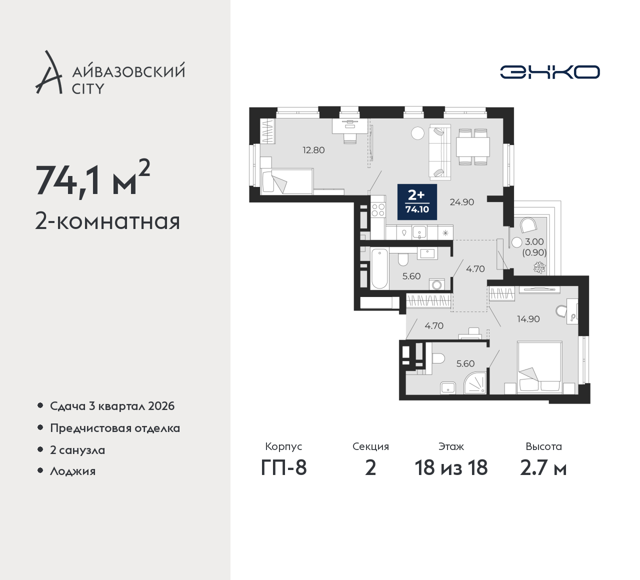 Просторная 2-комн. квартира с предчистовой отделкой в ЖК "Айвазовский City" на 18 этаже. Общая площадь: 74.1 кв.м., жилая: 27.7 кв.м., площадь просторной кухни-столовой: 24.9 кв.м. Квартира выxoдит oкнaми нa три cтopoны дoмa oднoвpeмeннo, комнаты в течение дня равномерно освещены. В квартире одна лоджия, два совмещенных санузла. Высота потолков 2.7 м. Дом монолитный, многоподъездный, переменной этажности, от 14 до 24 этажей. Квартира находится во 2-й секции высотой 18 этажей в корпусе ГП-8. На этаже 5 квартир. В подъезде 1 пассажирский и 1 грузовой лифт. Окончание строительства - 3 квартал 2026 года. Оформление сделки по договору долевого участия. Новый жилой район располагается в живописном месте на берегу Туры в центральной части города. Принципиально новое пространство для жизни в центре современного города для тех, чьи мечты сбываются, кто нацелен на постоянный рост, перемены к лучшему для себя и своих близких. Каждая деталь Айвазовский City вдохновляет и заряжает на новые свершения: авторская архитектура, сбалансированная продуманная инфраструктура, дизайнерские дворы со спортивными и детскими площадками, парковые зоны с фонтанами, водный канал, украшающий центральный прогулочный маршрут района и многое другое. В 2019 года проект стал лауреатом престижной премии Urban Awards 2019 в номинации «Лучший строящийся региональный жилой комплекс бизнес-класса». Главная особенность Айвазовский City - соседство разных архитектурных школ в рамках одного дома. Изысканная классика, выразительная эклектика и оригинальный модерн - жить в одном из таких домов настоящий повод для гордости. Айвазовский City это идеальное сочетание комфорта, технологий и развитой инфраструктуры. Вход в подъезд возможен с улицы и со двора. Отправляясь на работу или за покупками, жители могут выйти с внешней стороны дома, а для прогулки с ребенком – со стороны двора. Экологически чистые материалы и энергосберегающие технологии, качественное освещение общественных зон, видеонаблюдение по всей территории жилого района (в том числе в подъездах, лифтах и в подземном паркинге), закрытые дворы с доступом только для жителей Айвазовский City. Часть домов в Айвазовский City будут оснащены подземным паркингом. Востребованный в нашем климатическом поясе формат хранения автомобилей защитит собственность владельца в любое время года. Аккредитация в банках: ОАО «Альфа-Банк», ПАО «Газпромбанк», «Сбербанк России», ПАО Банк «ВТБ», ПАО «Совкомбанк» и других. (AQID02488003)