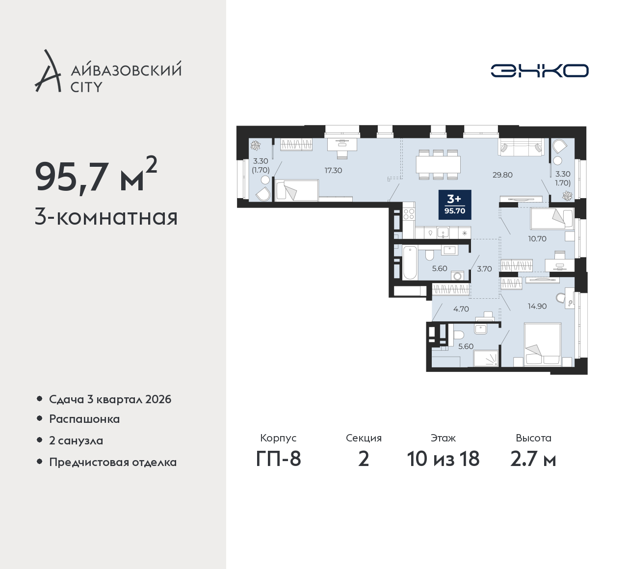 3-комн. квартира от застройщика с предчистовой отделкой в ЖК "Айвазовский City" на 10 этаже. Общая площадь: 95.7 кв.м., жилая: 42.6 кв.м., площадь просторной кухни-столовой: 24.7 кв.м. Квартира - распашонка, без проходных комнат, окна выходят на paзные стороны дома. В квартире два совмещенных санузла. Высота потолков 2.7 м. Дом монолитный, многоподъездный, переменной этажности, от 14 до 24 этажей. Квартира находится во 2-й секции высотой 18 этажей в корпусе ГП-8. На этаже 5 квартир. В подъезде 1 пассажирский и 1 грузовой лифт. Окончание строительства - 3 квартал 2026 года. Оформление сделки по договору долевого участия. Новый жилой район располагается в живописном месте на берегу Туры в центральной части города. Принципиально новое пространство для жизни в центре современного города для тех, чьи мечты сбываются, кто нацелен на постоянный рост, перемены к лучшему для себя и своих близких. Каждая деталь Айвазовский City вдохновляет и заряжает на новые свершения: авторская архитектура, сбалансированная продуманная инфраструктура, дизайнерские дворы со спортивными и детскими площадками, парковые зоны с фонтанами, водный канал, украшающий центральный прогулочный маршрут района и многое другое. В 2019 года проект стал лауреатом престижной премии Urban Awards 2019 в номинации «Лучший строящийся региональный жилой комплекс бизнес-класса». Главная особенность Айвазовский City - соседство разных архитектурных школ в рамках одного дома. Изысканная классика, выразительная эклектика и оригинальный модерн - жить в одном из таких домов настоящий повод для гордости. Айвазовский City это идеальное сочетание комфорта, технологий и развитой инфраструктуры. Вход в подъезд возможен с улицы и со двора. Отправляясь на работу или за покупками, жители могут выйти с внешней стороны дома, а для прогулки с ребенком – со стороны двора. Экологически чистые материалы и энергосберегающие технологии, качественное освещение общественных зон, видеонаблюдение по всей территории жилого района (в том числе в подъездах, лифтах и в подземном паркинге), закрытые дворы с доступом только для жителей Айвазовский City. Часть домов в Айвазовский City будут оснащены подземным паркингом. Востребованный в нашем климатическом поясе формат хранения автомобилей защитит собственность владельца в любое время года. Аккредитация в банках: «Сбербанк России», ПАО «Газпромбанк», ПАО Банк «ВТБ», ОАО «Альфа-Банк», ПАО Банк «ФК Открытие» и других. (AQID02488017)