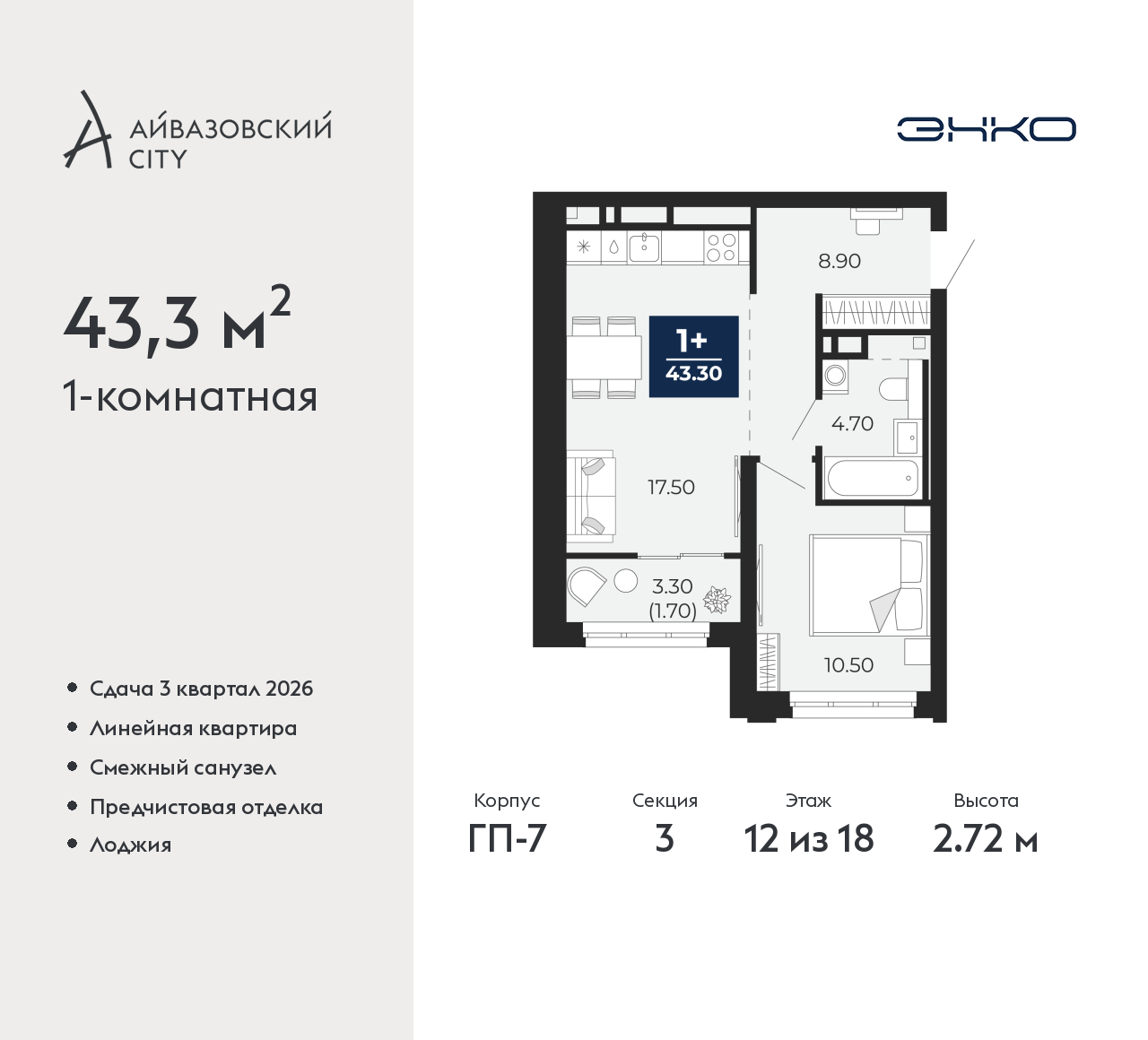 - Общая площадь 43.3 м²