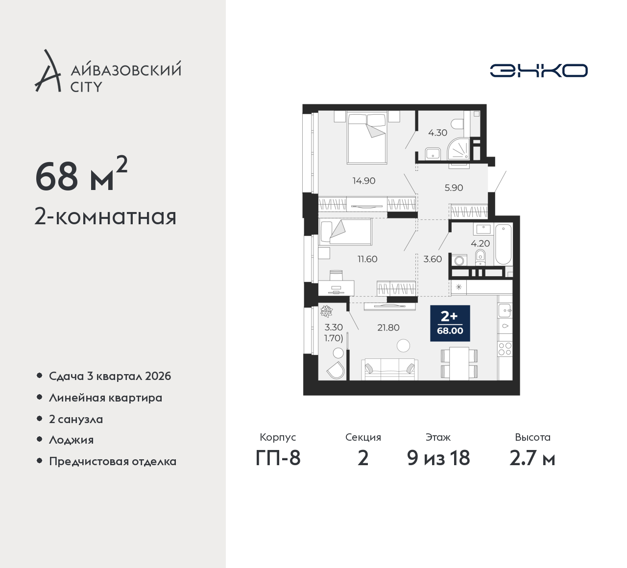 Просторная 2-комн. квартира с предчистовой отделкой в ЖК "Айвазовский City" на 9 этаже. Общая площадь: 68 кв.м., жилая: 26.5 кв.м., площадь просторной кухни-столовой: 21.8 кв.м. Комнаты изолированные, все окна выходят на одну сторону. В квартире одна лоджия, два совмещенных санузла. Высота потолков 2.7 м. Дом монолитный, многоподъездный, переменной этажности, от 14 до 24 этажей. Квартира находится во 2-й секции высотой 18 этажей в корпусе ГП-8. На этаже 5 квартир. В подъезде 1 пассажирский и 1 грузовой лифт. Окончание строительства - 3 квартал 2026 года. Оформление сделки по договору долевого участия. Новый жилой район располагается в живописном месте на берегу Туры в центральной части города. Принципиально новое пространство для жизни в центре современного города для тех, чьи мечты сбываются, кто нацелен на постоянный рост, перемены к лучшему для себя и своих близких. Каждая деталь Айвазовский City вдохновляет и заряжает на новые свершения: авторская архитектура, сбалансированная продуманная инфраструктура, дизайнерские дворы со спортивными и детскими площадками, парковые зоны с фонтанами, водный канал, украшающий центральный прогулочный маршрут района и многое другое. В 2019 года проект стал лауреатом престижной премии Urban Awards 2019 в номинации «Лучший строящийся региональный жилой комплекс бизнес-класса». Главная особенность Айвазовский City - соседство разных архитектурных школ в рамках одного дома. Изысканная классика, выразительная эклектика и оригинальный модерн - жить в одном из таких домов настоящий повод для гордости. Айвазовский City это идеальное сочетание комфорта, технологий и развитой инфраструктуры. Вход в подъезд возможен с улицы и со двора. Отправляясь на работу или за покупками, жители могут выйти с внешней стороны дома, а для прогулки с ребенком – со стороны двора. Экологически чистые материалы и энергосберегающие технологии, качественное освещение общественных зон, видеонаблюдение по всей территории жилого района (в том числе в подъездах, лифтах и в подземном паркинге), закрытые дворы с доступом только для жителей Айвазовский City. Часть домов в Айвазовский City будут оснащены подземным паркингом. Востребованный в нашем климатическом поясе формат хранения автомобилей защитит собственность владельца в любое время года. Аккредитация в банках: ПАО «Газпромбанк», ПАО Банк «ВТБ», ОАО «Альфа-Банк», «Сбербанк России», ПАО Банк «ФК Открытие» и других. (AQID02500470)